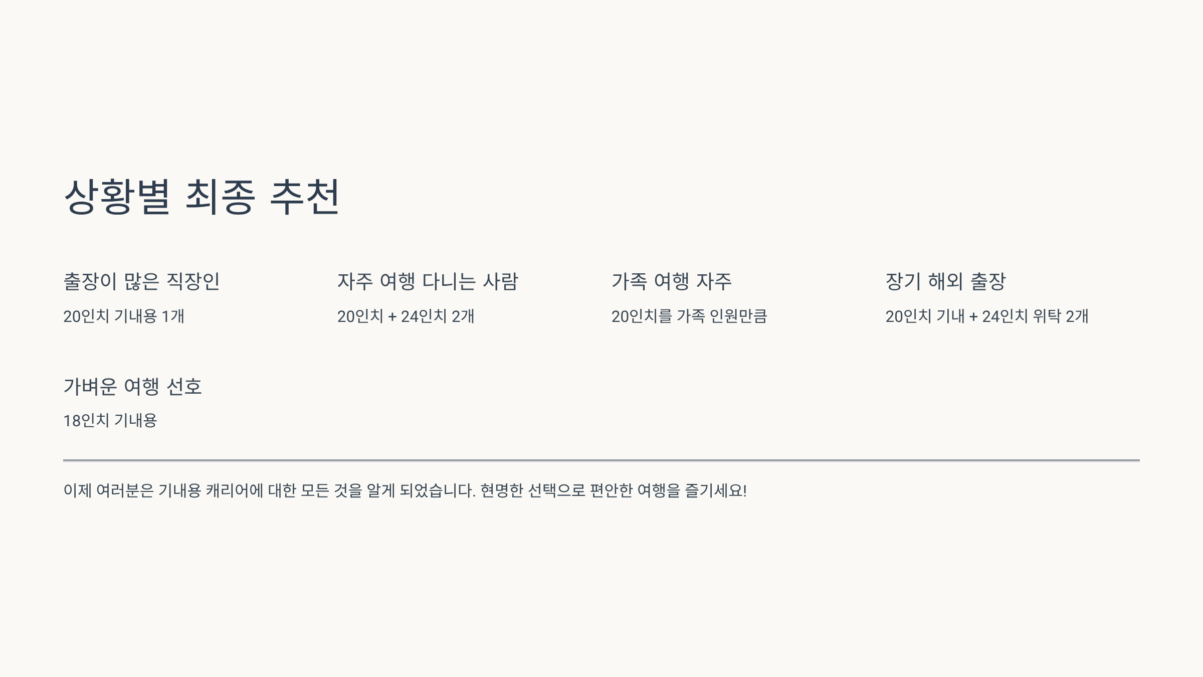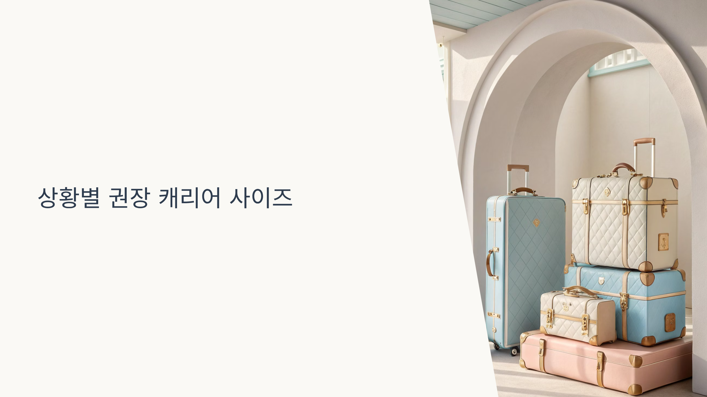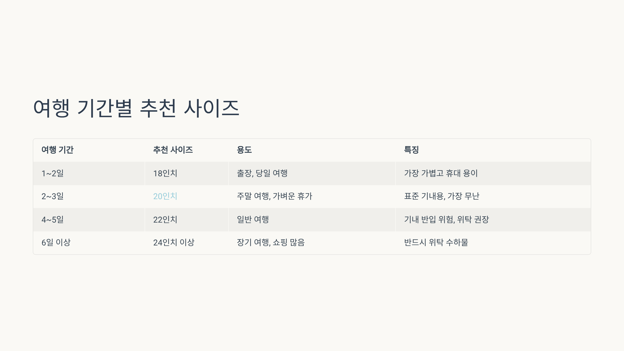 | 2~3일 | 20인치 | 주말 여행, 가벼운 휴가 | 표준 기내용, 가장 무난 |