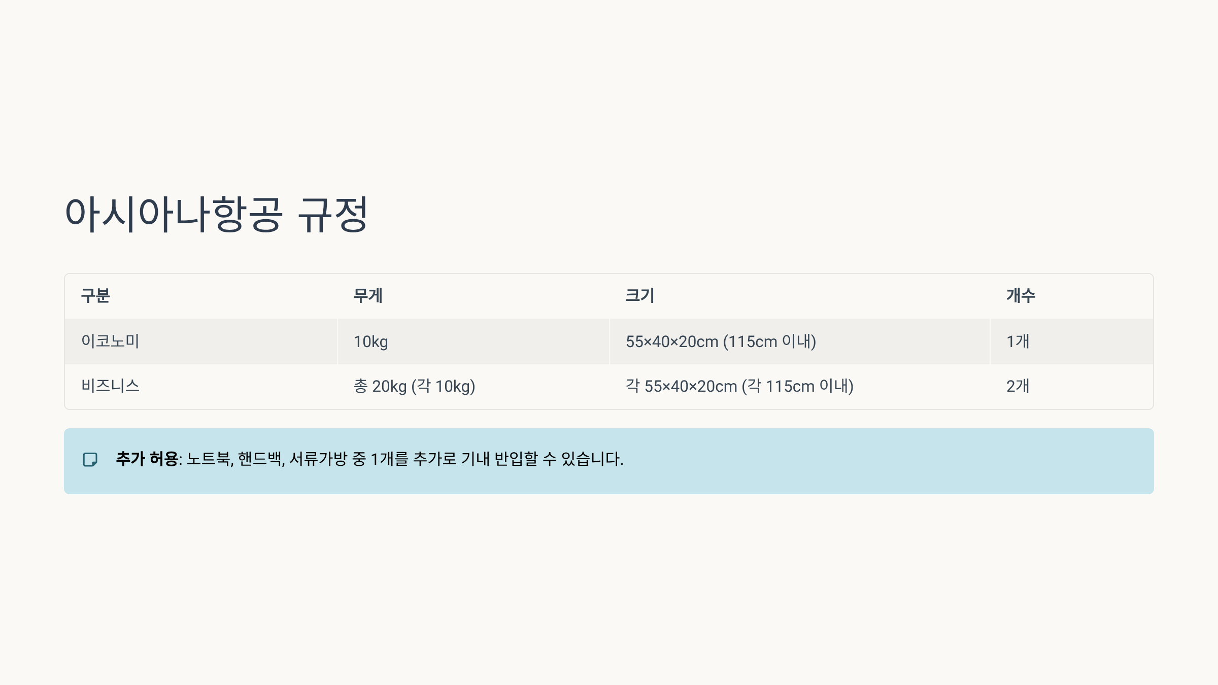 | 비즈니스 | 총 20kg (각 10kg) | 각 55cm × 40cm × 20cm (각 115cm 이내) | 2개 |