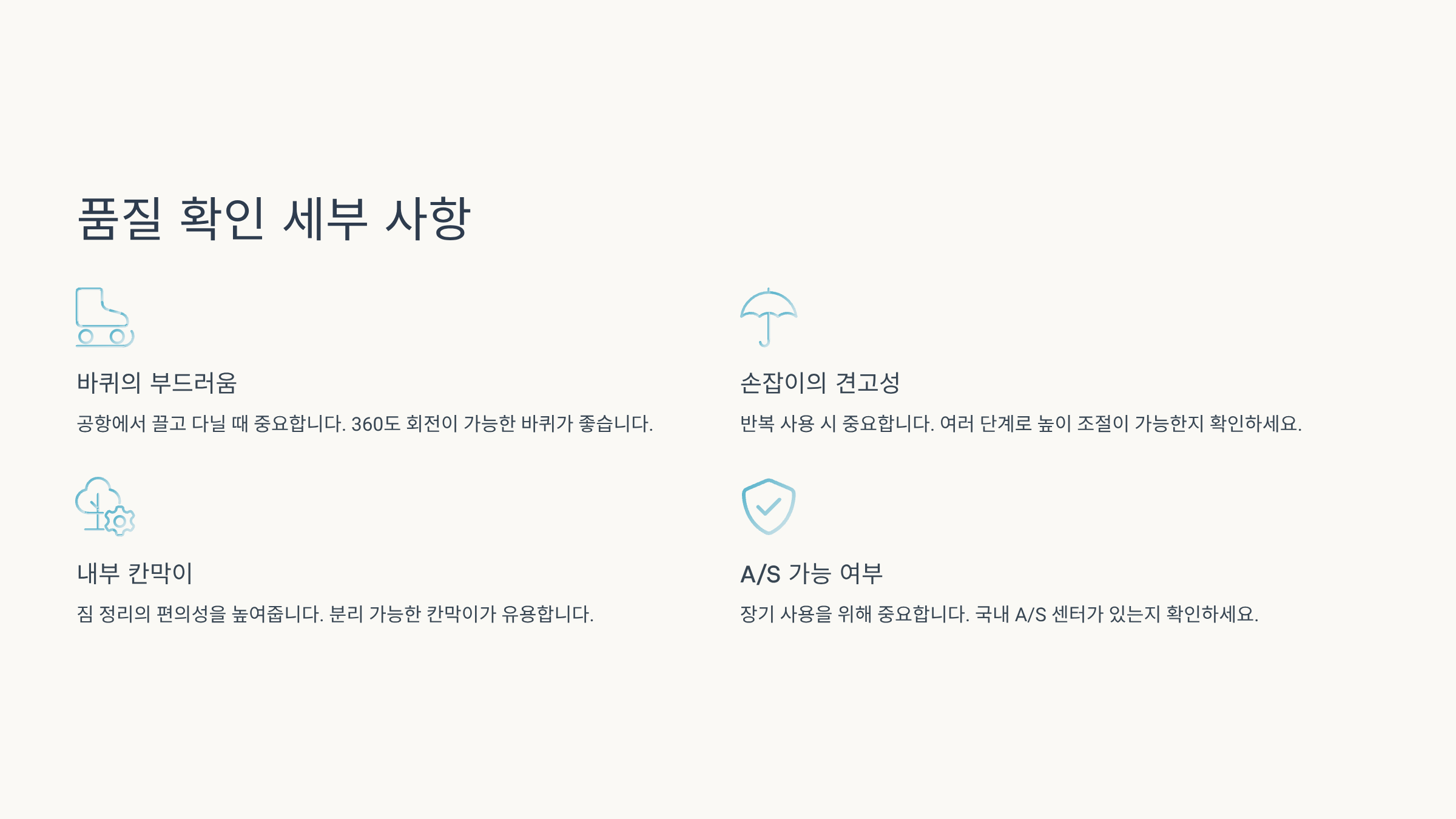 - 바퀴의 부드러움 → 공항에서 끌고 다닐 때 중요