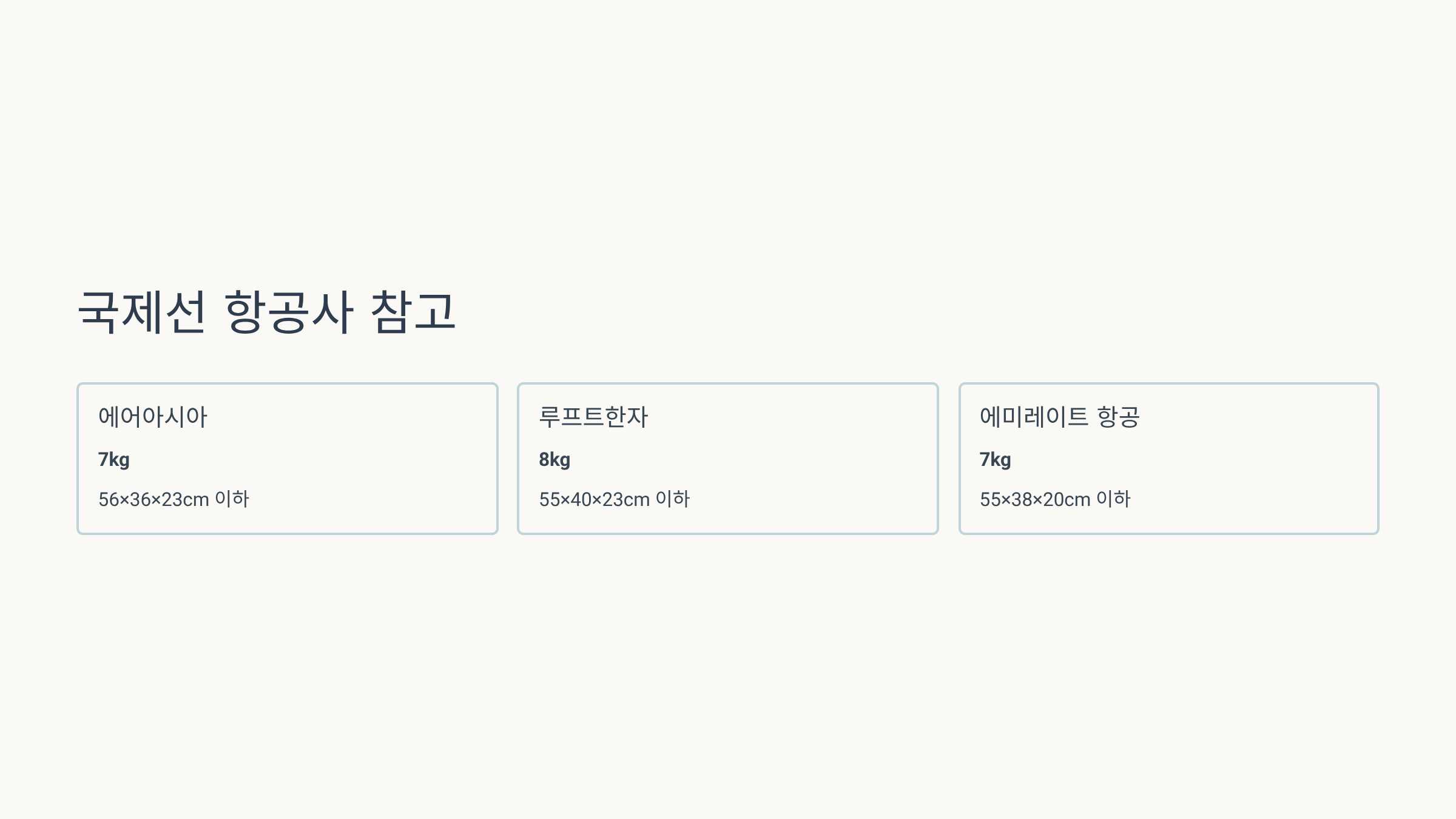 - 에미레이트 항공: 7kg, 55cm × 38cm × 20cm 이하