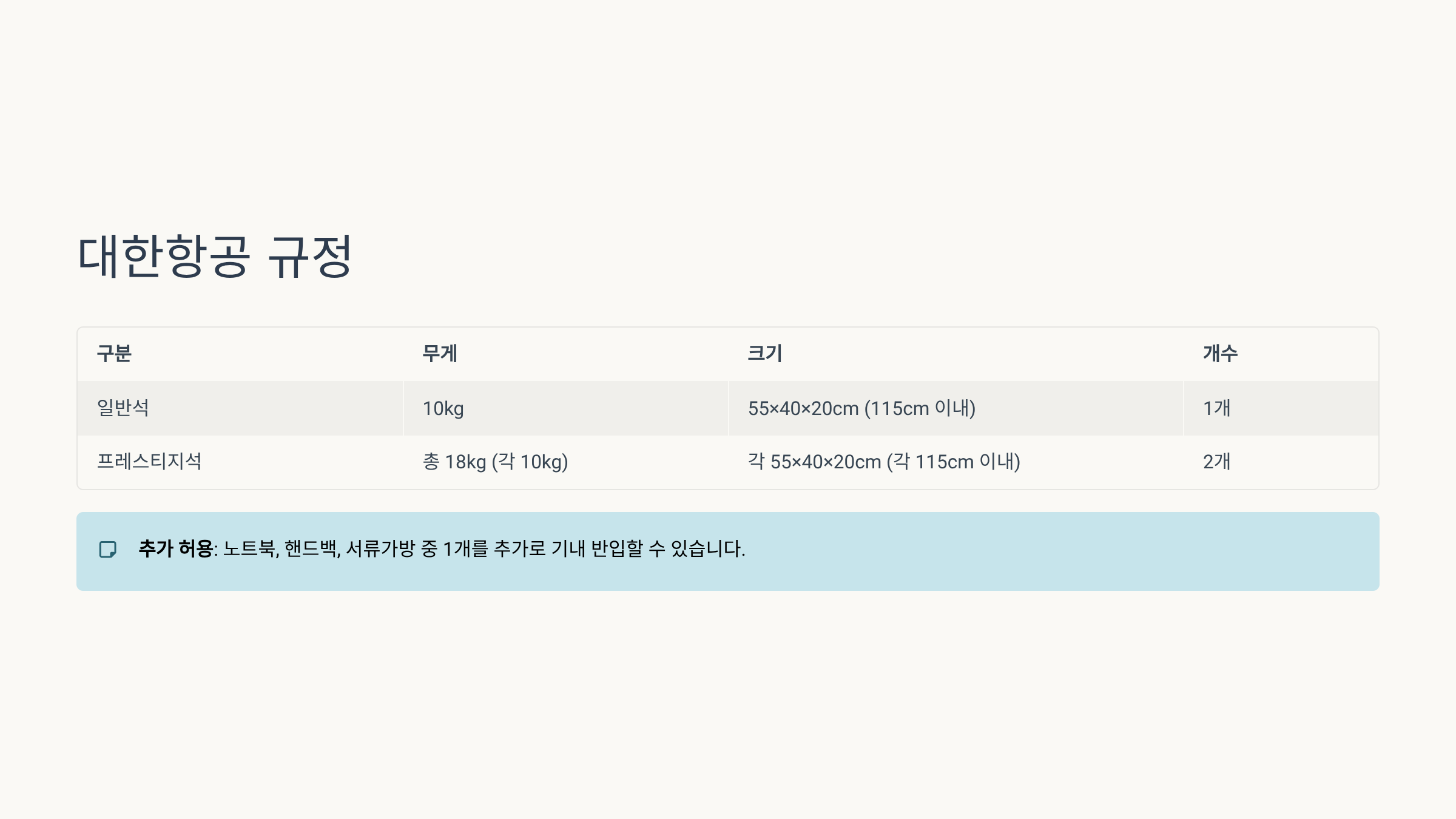 | 프레스티지석 | 총 18kg (각 10kg) | 각 55cm × 40cm × 20cm (각 115cm 이내) | 2개 |