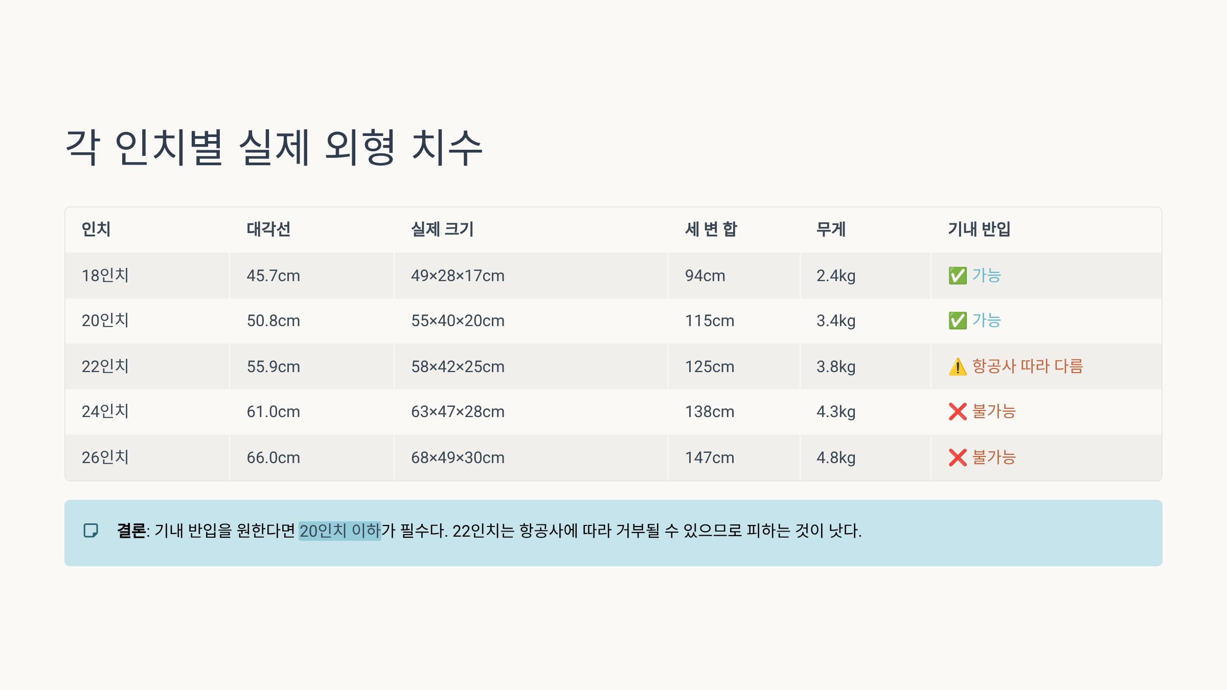 결론: 기내 반입을 원한다면 20인치 이하가 필수다. 22인치는 항공사에 따라 거부될 수 있으므로 피하는 것이 낫다.