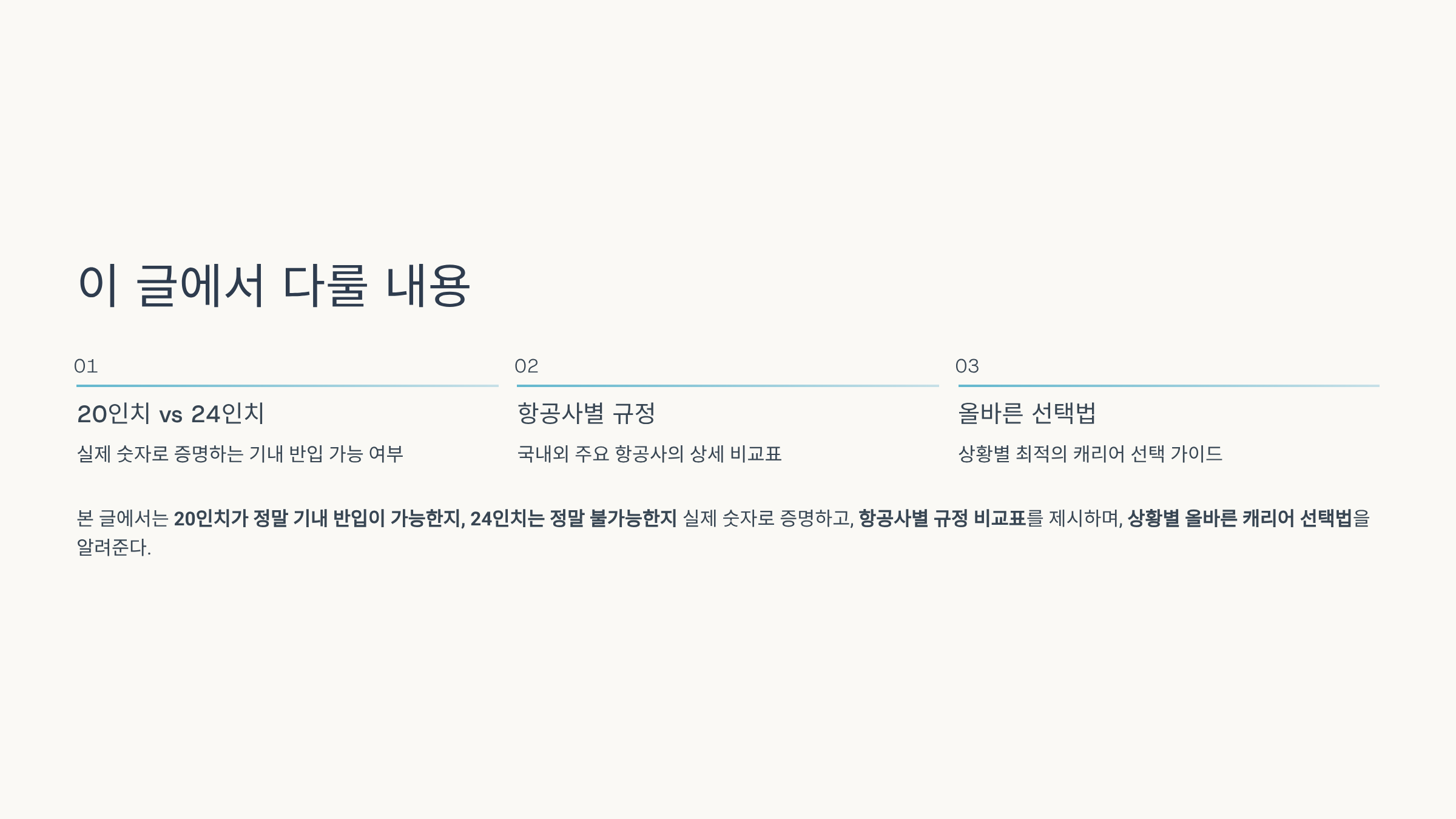 본 글에서는 20인치가 정말 기내 반입이 가능한지, 24인치는 정말 불가능한지 실제 숫자로 증명하고, 항공사별 규정 비교표를 제시하며, 상황별 올바른 캐리어 선택법을 알려준다.