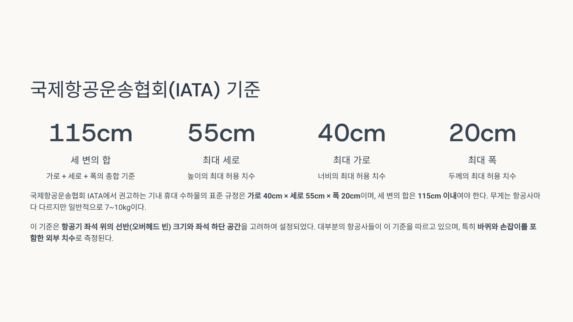 이 기준은 항공기 좌석 위의 선반(오버헤드 빈) 크기와 좌석 하단 공간을 고려하여 설정되었다. 대부분의 항공사들이 이 기준을 따르고 있으며, 특히 바퀴와 손잡이를 포함한 외부 치수로 측정된다.