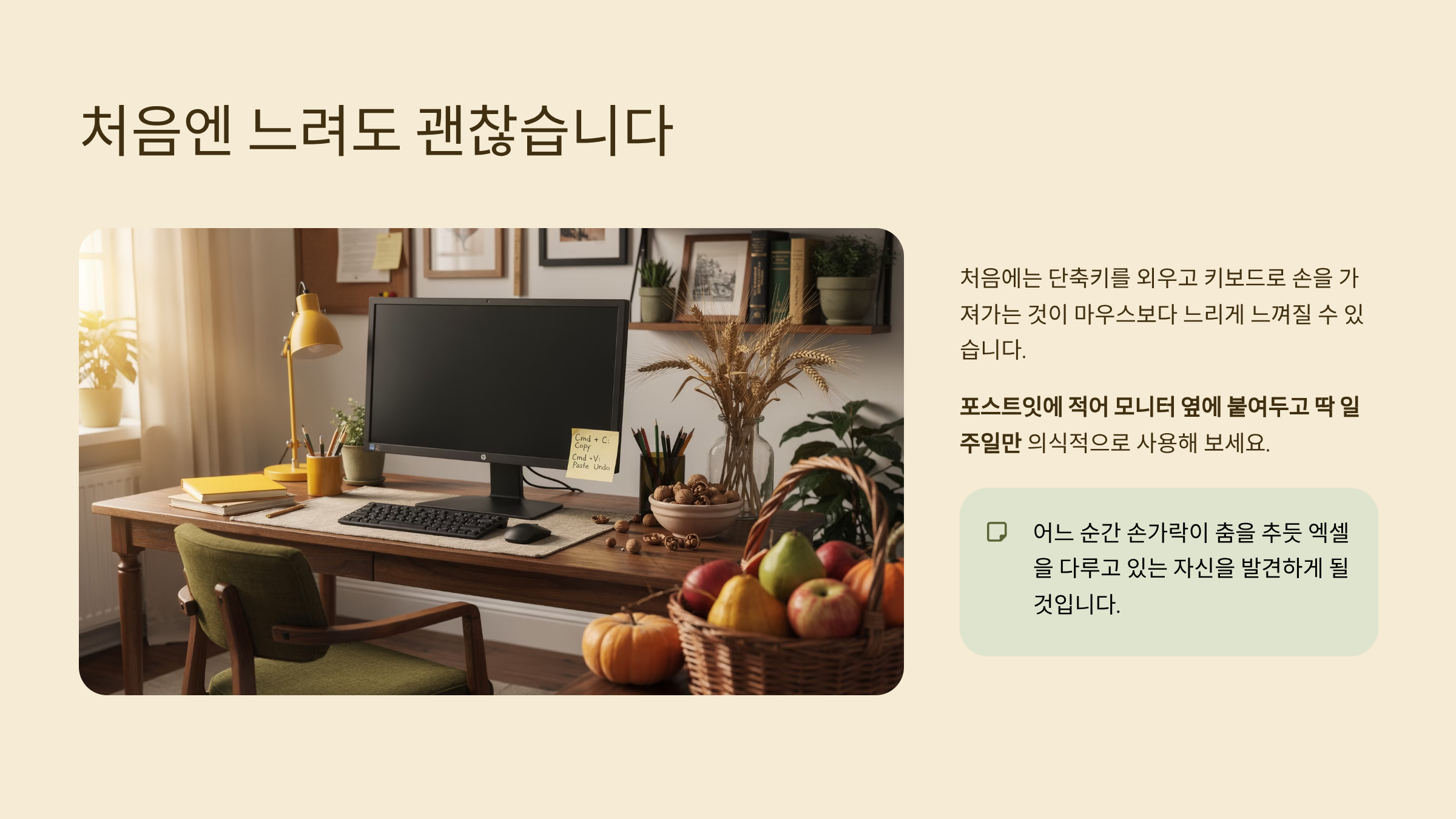 처음에는 단축키를 외우고 키보드로 손을 가져가는 것이 마우스보다 느리게 느껴질 수 있습니다. 하지만 포스트잇에 적어 모니터 옆에 붙여두고 딱 일주일만 의식적으로 사용해 보세요. 어느 순간 화면을 보지 않고도 손가락이 춤을 추듯 엑셀을 다루고 있는 자신을 발견하게 될 것입니다.