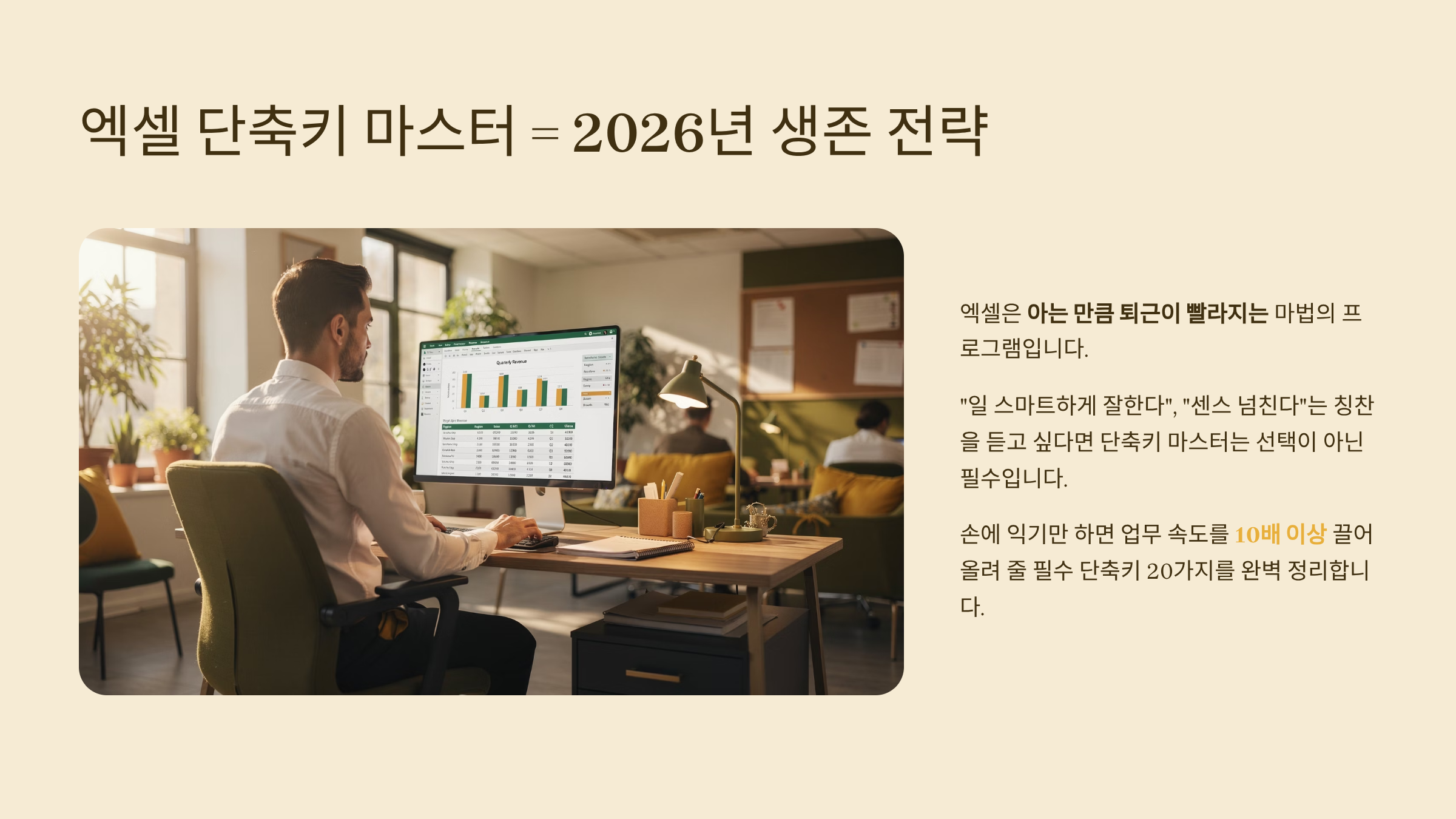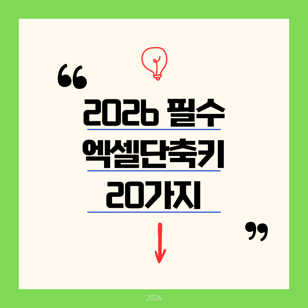엑셀은 아는 만큼 퇴근이 빨라지는 마법의 프로그램입니다. 2026년, 직장에서 "일 참 스마트하게 잘한다", "센스 넘친다"는 칭찬을 듣고 싶다면 엑셀 단축키 마스터는 선택이 아닌 필수 생존 전략입니다. 회사에서 모르면 진짜 바보 취급받기 딱 좋은, 하지만 손에 익기만 하면 업무 속도를 10배 이상 끌어올려 줄 '2026년 직장인 필수 엑셀 단축키 20가지'를 완벽하게 정리해 드립니다. 이 글을 스크랩해 두시고 매일 아침 업무 시작 전 한 번씩만 읽어보세요. 여러분의 직장 생활이 달라질 것입니다!