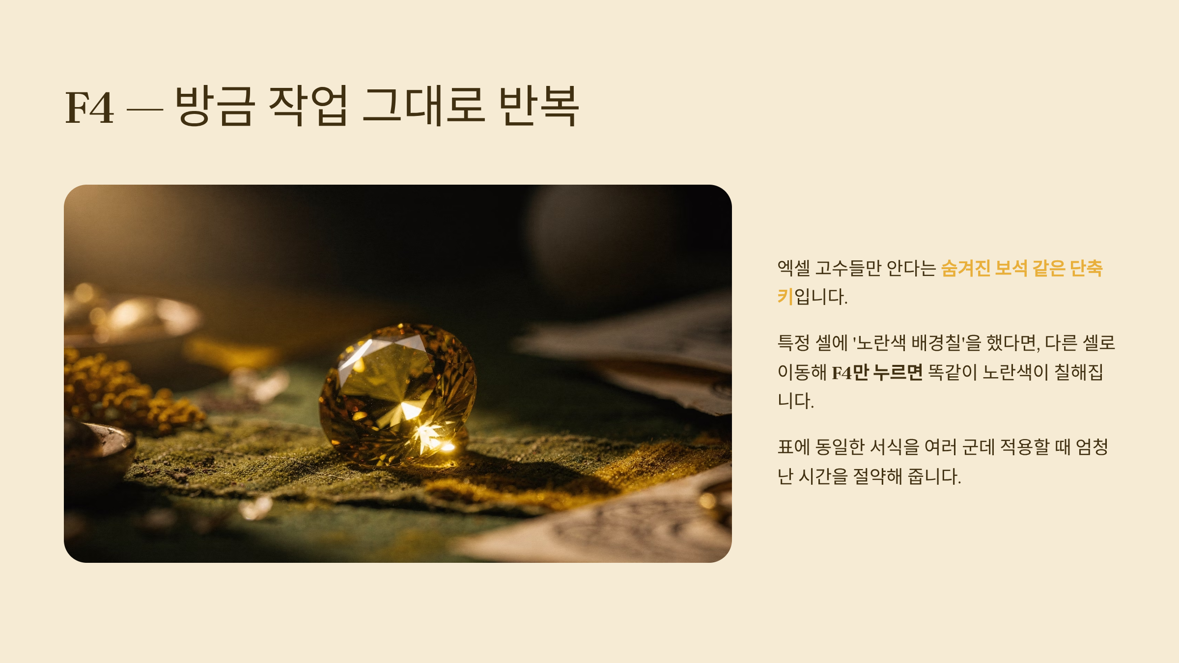* 7. F4 (방금 작업 그대로 반복): 엑셀 고수들만 안다는 숨겨진 보석 같은 단축키입니다. 예를 들어, 특정 셀에 '노란색 배경칠'을 했다면, 다른 셀로 이동해 F4만 누르면 똑같이 노란색이 칠해집니다. 표에 동일한 서식을 여러 군데 적용할 때 엄청난 시간을 절약해 줍니다.