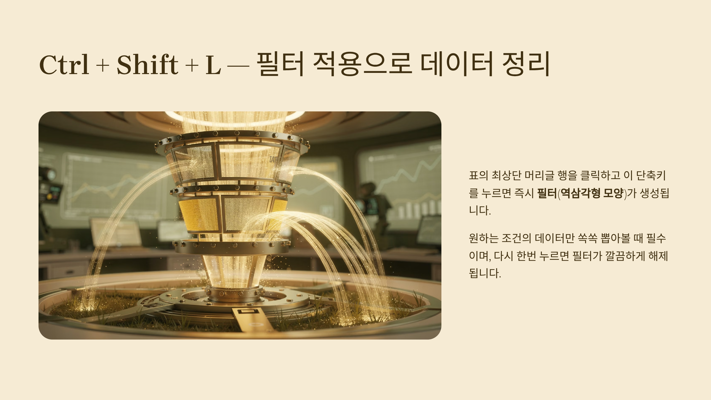 * 14. Ctrl + Shift + L (필터 적용으로 데이터 정리): 표의 최상단 머리글 행을 클릭하고 이 단축키를 누르면 즉시 '필터(역삼각형 모양)'가 생성됩니다. 원하는 조건의 데이터만 쏙쏙 뽑아볼 때 필수이며, 다시 한번 누르면 필터가 깔끔하게 해제됩니다.