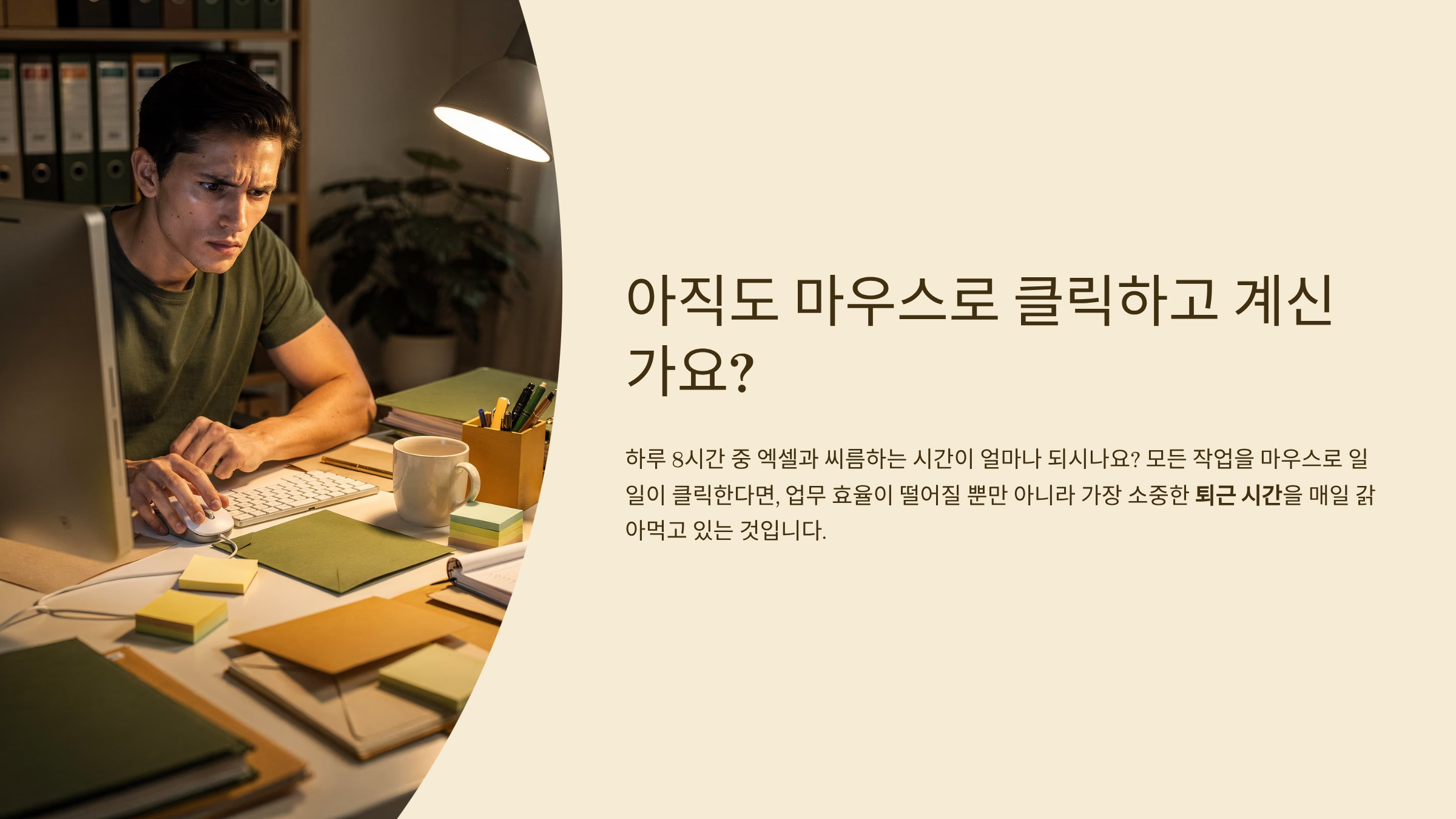 직장인 여러분, 하루 8시간의 업무 시간 중 엑셀(Excel) 화면을 쳐다보고 씨름하는 시간이 얼마나 되시나요? 혹시 아직도 모든 작업을 마우스로 일일이 메뉴 탭을 클릭해 가며 하고 계신가요? 그렇다면 여러분은 남들보다 업무 효율이 현저히 떨어질 뿐만 아니라, 가장 소중한 여러분의 '퇴근 시간'을 매일 갉아먹고 있는 것과 같습니다.