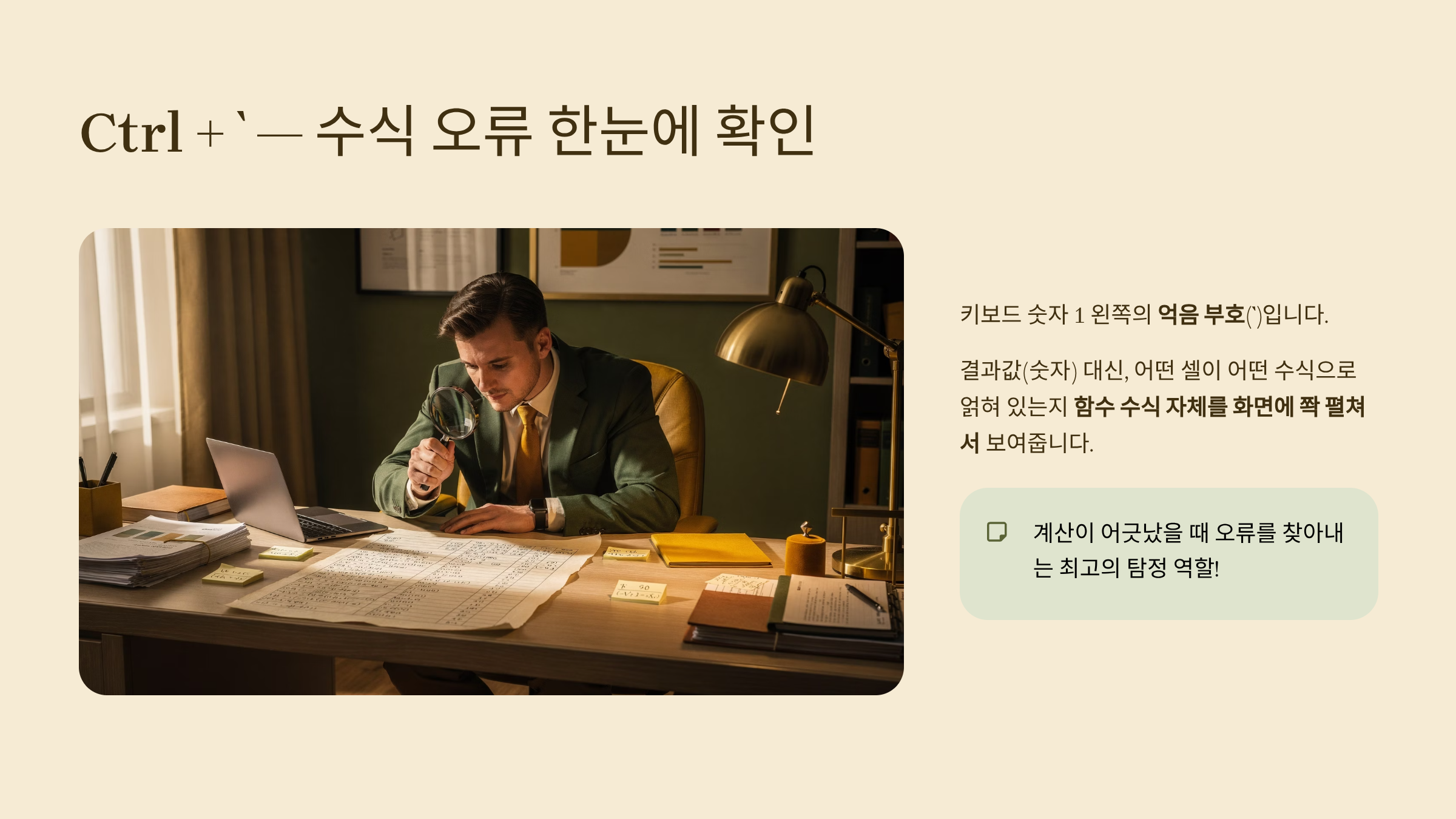 * 18. Ctrl + (수식 오류 한눈에 확인):*키보드 숫자 1 왼쪽에 있는 억음 부호()입니다. 표에 입력된 결과값(숫자) 대신, 어떤 셀이 어떤 수식으로 얽혀 있는지 함수 수식 자체를 화면에 쫙 펼쳐서 보여줍니다. 계산이 어긋났을 때 오류를 찾아내는 최고의 탐정 역할을 합니다.