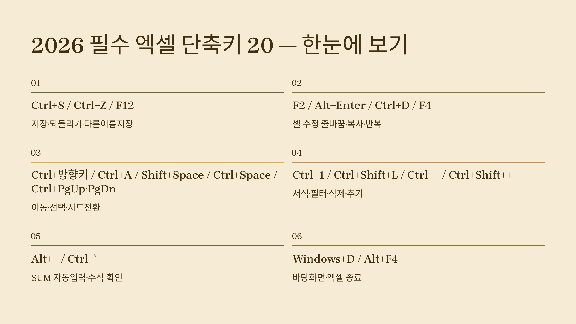 단축키는 단순한 기능 암기가 아니라 여러분의 워라밸을 지켜주는 강력한 무기입니다. 오늘부터 당장 실무에 적용하여 스마트한 2026년을 만들어보세요!