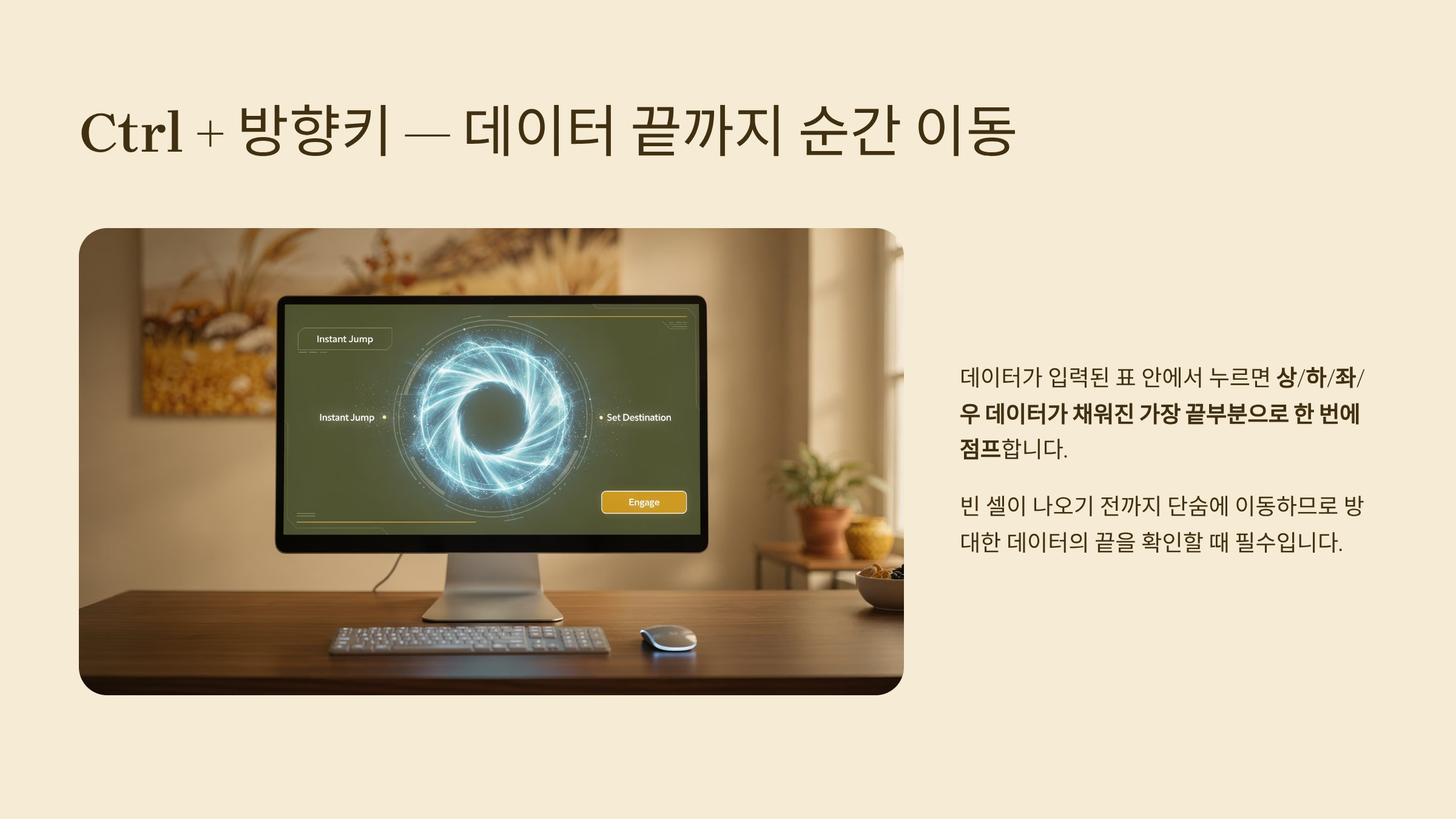 * 8. Ctrl + 방향키 (데이터 끝까지 순간 이동): 데이터가 입력된 표 안에서 이 단축키를 누르면 상/하/좌/우 데이터가 채워진 가장 끝부분으로 한 번에 점프합니다. 빈 셀이 나오기 전까지 단숨에 이동하므로 방대한 데이터의 끝을 확인할 때 필수입니다.