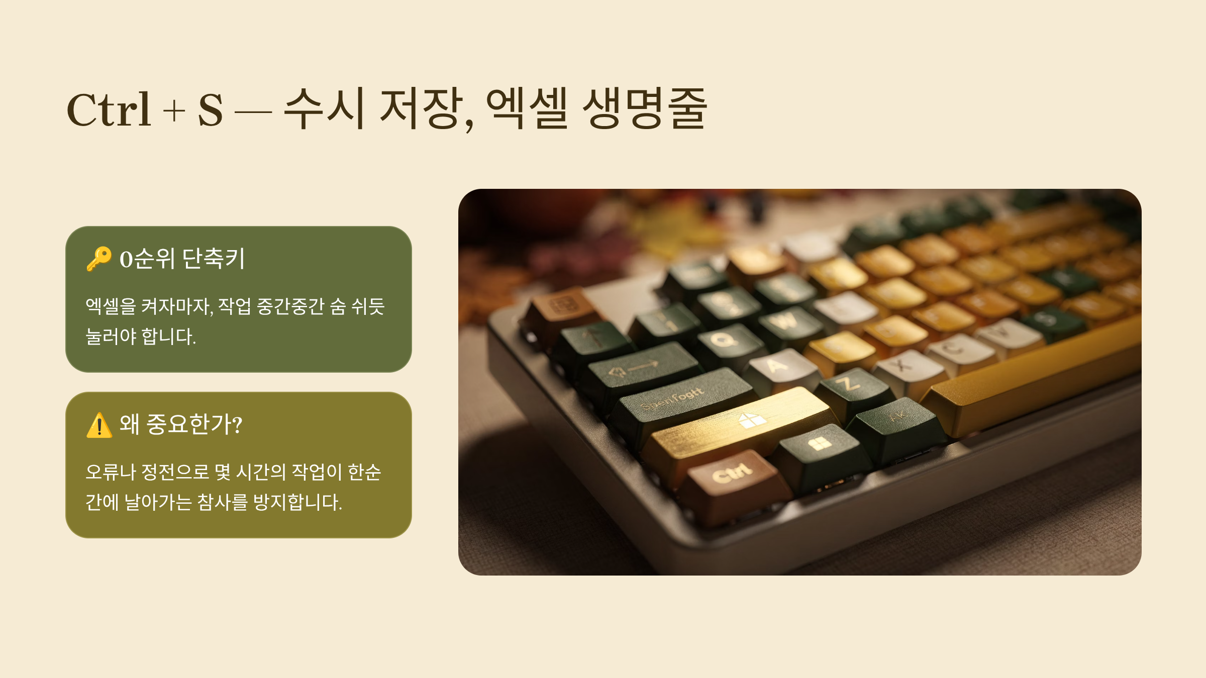 * 1. Ctrl + S (수시 저장, 엑셀 생명줄): 엑셀을 켜자마자, 그리고 작업하는 중간중간 숨을 쉬듯이 눌러야 하는 0순위 단축키입니다. 몇 시간 동안 땀 흘려 작성한 견적서나 보고서가 엑셀 오류나 정전으로 한순간에 날아가는 끔찍한 경험을 피하려면, 왼손 새끼손가락과 검지는 항상 이 키 위에 있어야 합니다.