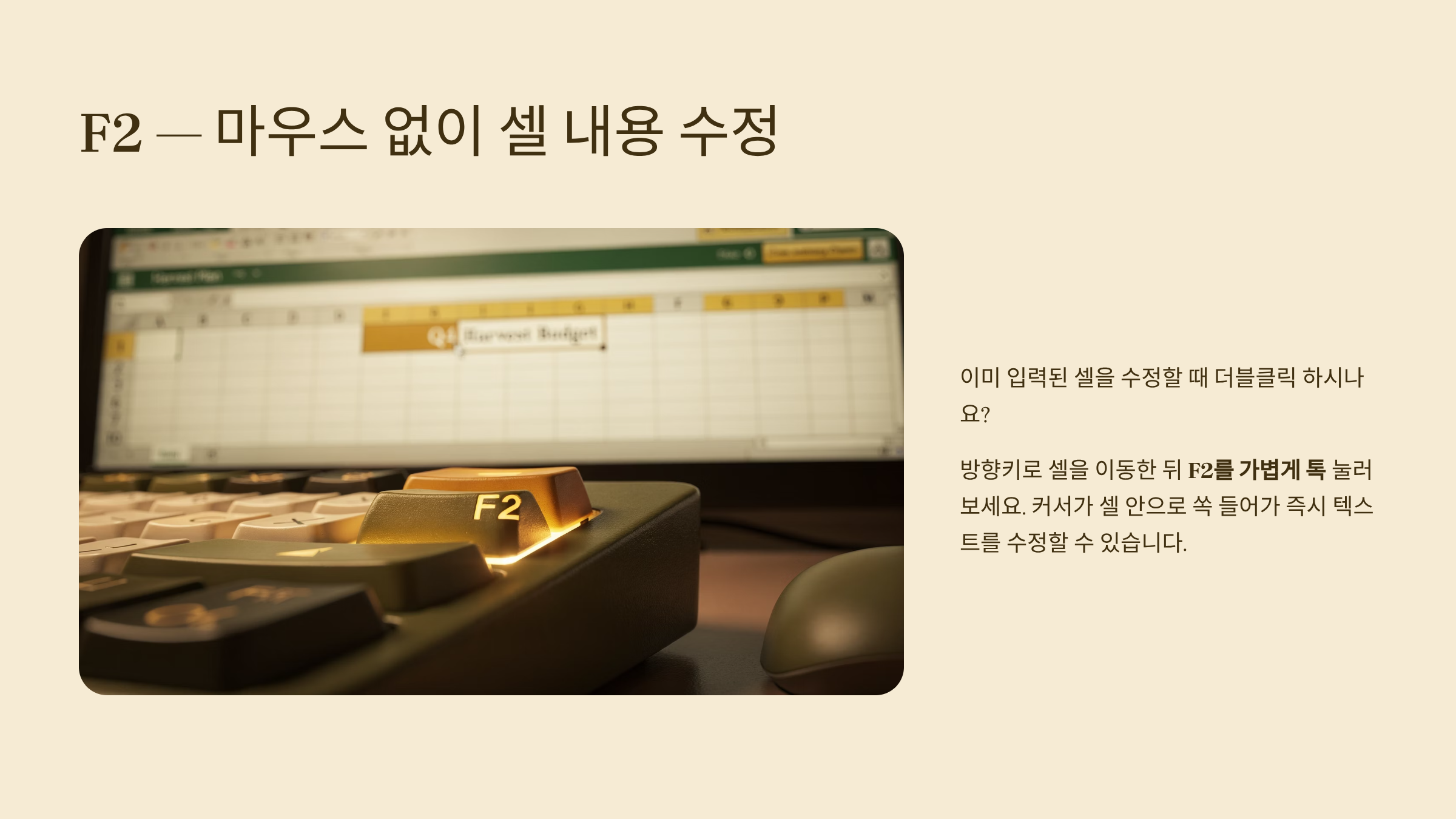 * 4. F2 (마우스 없이 셀 내용 수정): 이미 입력된 셀의 글자를 수정할 때 더블클릭을 하시나요? 이제 방향키로 셀을 이동한 뒤 F2를 가볍게 톡 눌러보세요. 커서가 셀 안으로 쏙 들어가 즉시 텍스트를 수정할 수 있습니다.