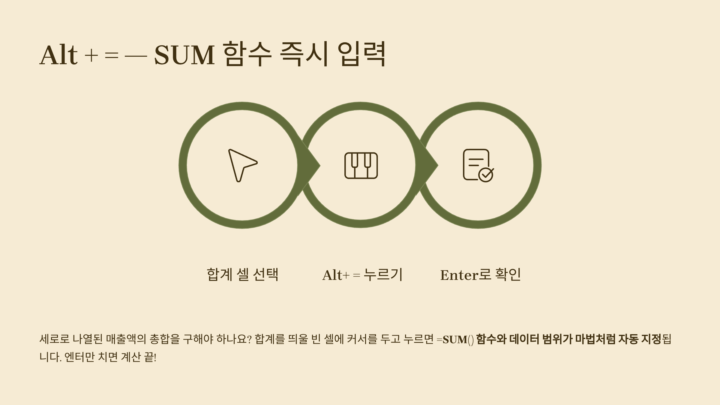 * 17. Alt + = (SUM 함수 즉시 입력): 세로로 나열된 매출액의 총합을 구해야 하나요? 합계를 띄울 빈 셀에 커서를 두고 이 단축키를 누르세요. =SUM() 함수와 함께 더해야 할 데이터 범위가 마법처럼 자동으로 지정됩니다. 엔터만 치면 계산 끝!