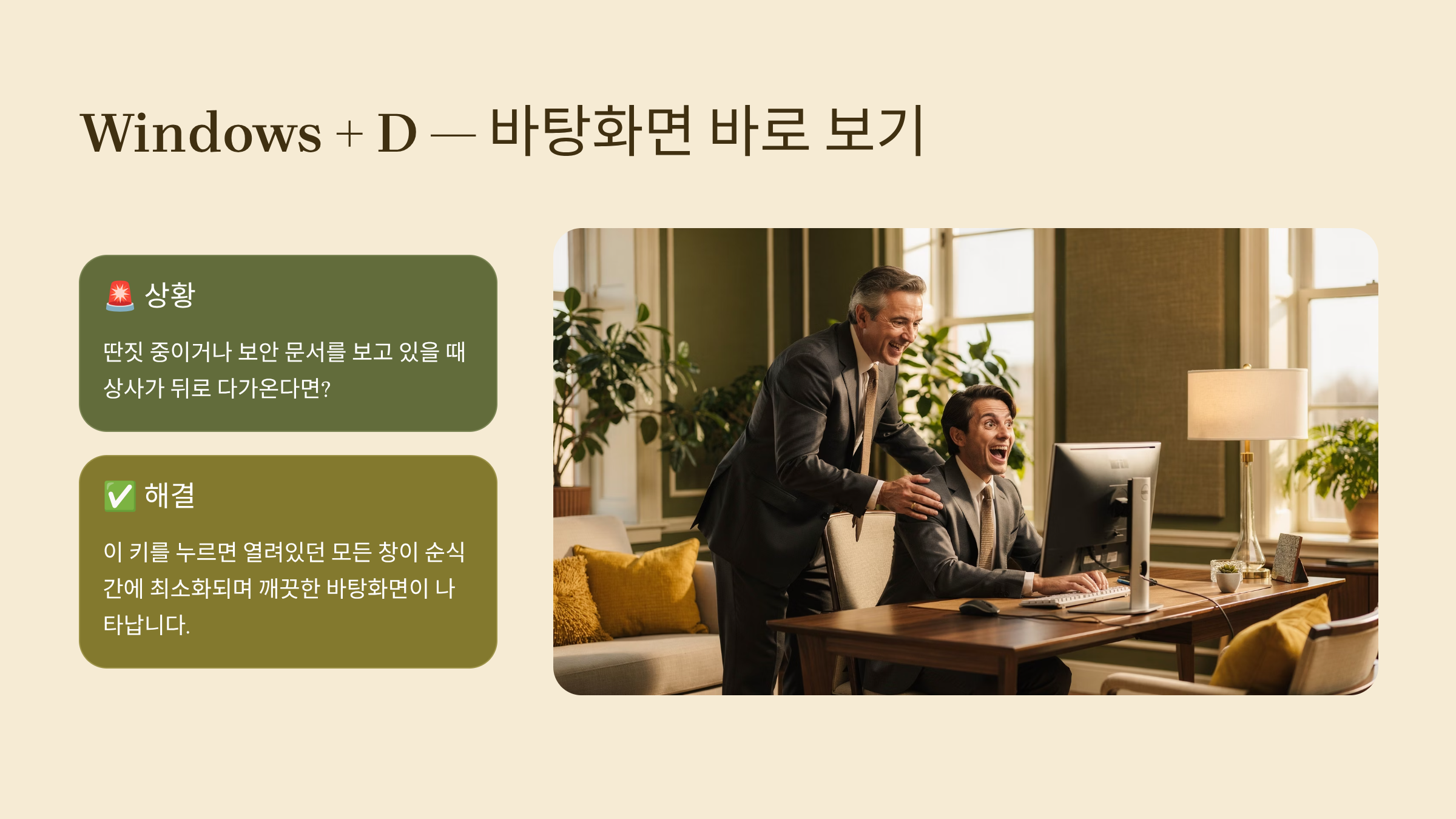 * 19. Windows + D (바탕화면 바로 보기): 엑셀 전용은 아니지만 회사원이라면 무조건 알아야 합니다. 딴짓을 하거나 보안 보안이 필요한 문서를 보고 있을 때 상사가 뒤로 다가온다면? 이 키를 누르면 열려있던 모든 창이 순식간에 최소화되며 깨끗한 바탕화면이 나타납니다.