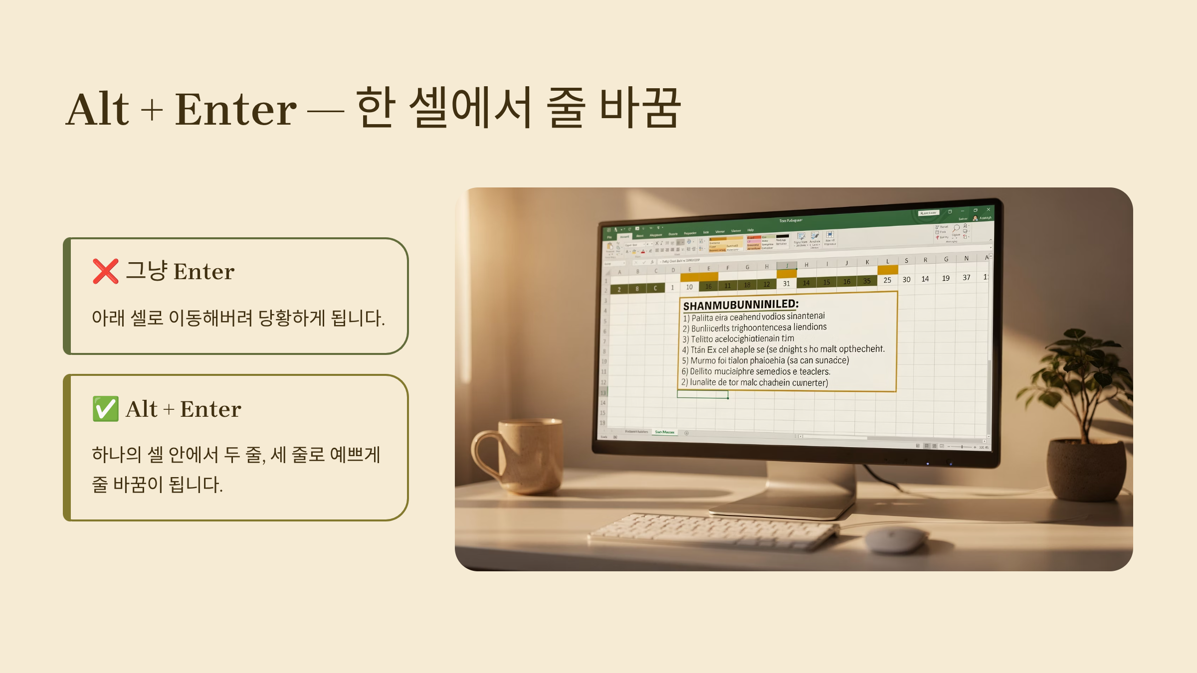 * 5. Alt + Enter (한 셀에서 줄 바꿈): 엑셀에서 무작정 Enter를 누르면 아래 셀로 이동해버려 당황하신 적 있으실 겁니다. 하나의 셀 칸 안에서 두 줄, 세 줄로 내용을 예쁘게 줄 바꿈 하여 정리하고 싶다면 반드시 Alt 키를 누른 상태에서 Enter를 치셔야 합니다.