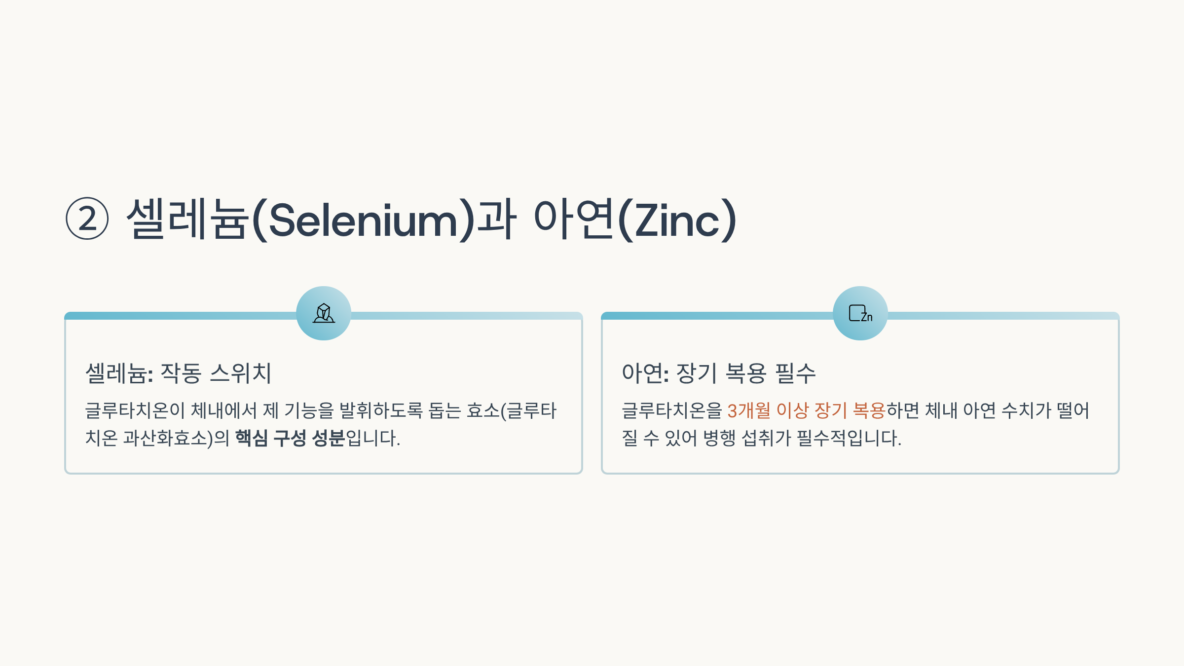 2. 셀레늄(Selenium)과 아연(Zinc) 아무리 글루타치온이 많아도 이 미네랄들이 없으면 작동 스위치를 켤 수 없습니다. 셀레늄은 글루타치온이 체내에서 제 기능을 발휘하도록 돕는 효소(글루타치온 과산화효소)의 핵심 구성 성분입니다. 또한, 글루타치온을 3개월 이상 장기 복용할 경우 체내 아연 수치가 떨어질 수 있으므로, 셀레늄과 아연이 복합된 미네랄을 병행 섭취하는 것이 장기적인 건강 유지에 필수적입니다.