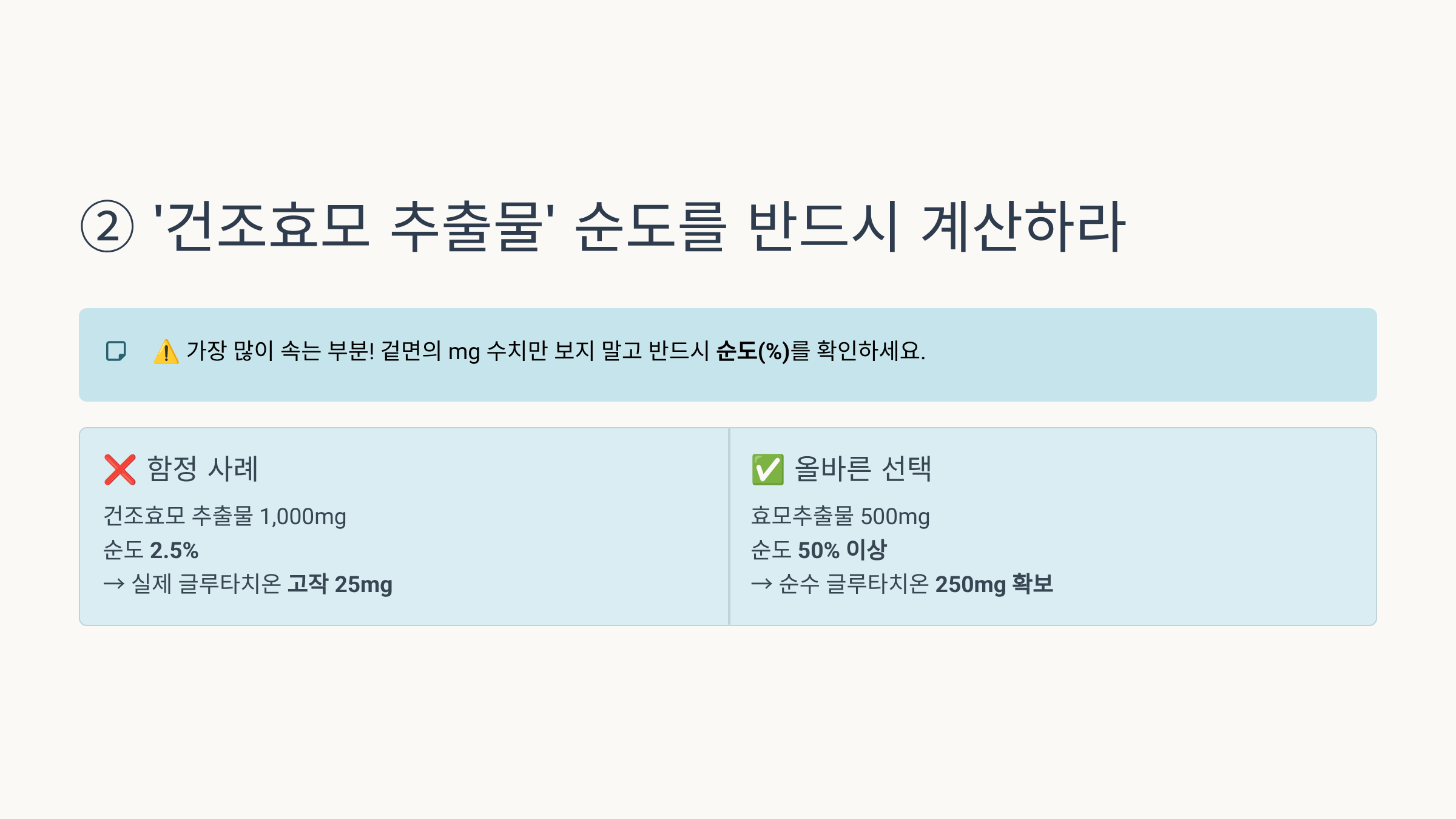 2. '건조효모 추출물'의 순도를 반드시 계산하라 건강기능식품법상 글루타치온은 주로 '건조효모 추출물' 형태로 표기됩니다. 여기서 가장 크게 속는 부분이 바로 '순도'입니다. 제품 겉면에 '건조효모 추출물 1,000mg'이라고 크게 적혀 있어도, 해당 추출물의 순도가 2.5%라면 실제 순수 글루타치온은 고작 25mg에 불과합니다. 따라서 반드시 순도가 50% 이상인 고순도 원료를 사용했는지 확인해야 합니다. (예: 순도 50% 효모추출물 500mg = 순수 글루타치온 250mg).
