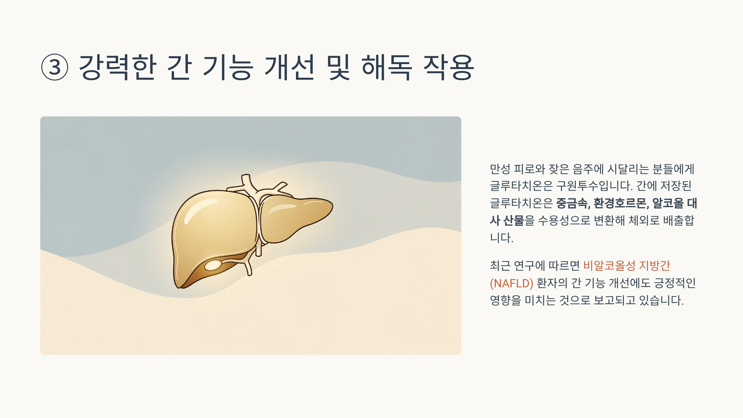 3. 강력한 간 기능 개선 및 해독 작용 만성 피로에 시달리거나 음주가 잦은 직장인들에게 글루타치온은 구원투수와 같습니다. 체내 글루타치온의 상당 부분은 우리 몸의 화학 공장인 '간'에 저장되어 있습니다. 체내로 들어온 중금속, 환경호르몬, 알코올 대사 산물 등 각종 독소 물질은 간에서 글루타치온과 강하게 결합하여 수용성으로 변환된 뒤 소변이나 땀을 통해 체외로 안전하게 배출됩니다. 간세포를 보호하고 해독 능력을 극대화하여 만성 피로를 근본적으로 개선합니다. 최근 연구에 따르면 비알코올성 지방간(NAFLD) 환자의 간 기능 개선에도 긍정적인 영향을 미치는 것으로 보고되고 있습니다.