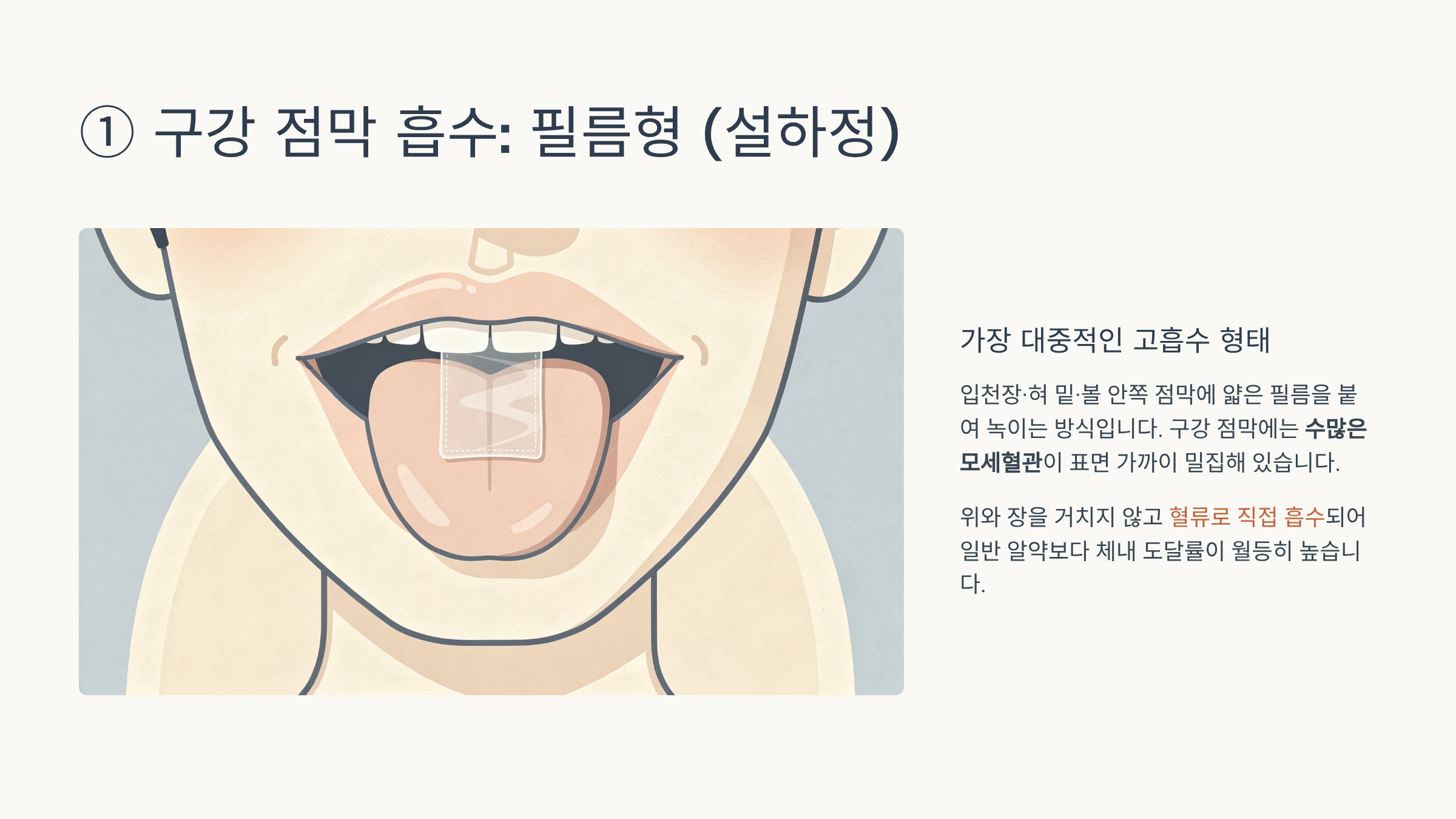 1. 구강 점막에 붙이는 '필름형 (설하정)' 가장 대중적으로 인기를 끌고 있는 형태입니다. 입천장이나 혀 밑, 볼 안쪽의 점막에 얇은 필름을 붙여 녹여 먹는 방식입니다. 구강 점막은 수많은 모세혈관이 피부 표면 가까이 밀집해 있는 구조를 가지고 있습니다. 필름이 점막에 녹아들면서 위와 장이라는 험난한 소화 기관을 거치지 않고 혈류로 직접 흡수되기 때문에, 일반 알약보다 체내 도달률이 월등히 높아진다는 큰 장점이 있습니다.