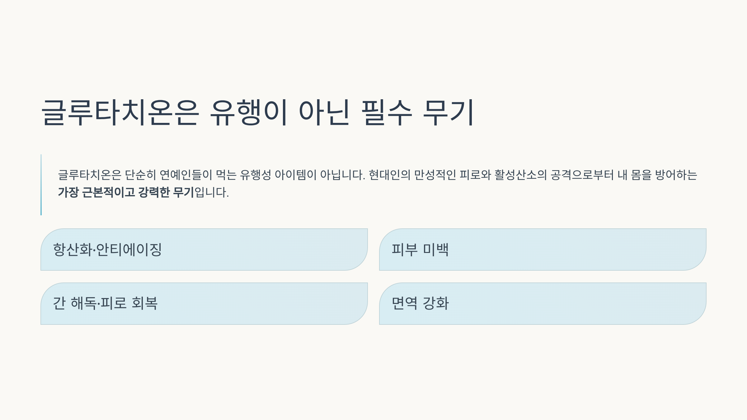 결론적으로 글루타치온은 단순히 연예인들이 먹는 유행성 아이템이 아니라, 현대인의 만성적인 피로와 활성산소의 공격으로부터 내 몸을 방어하는 가장 근본적이고 강력한 무기입니다.