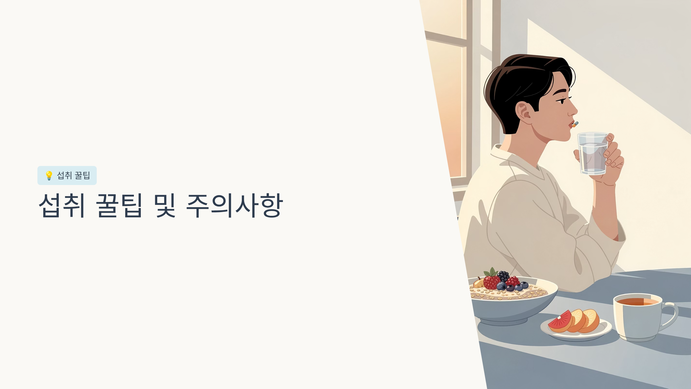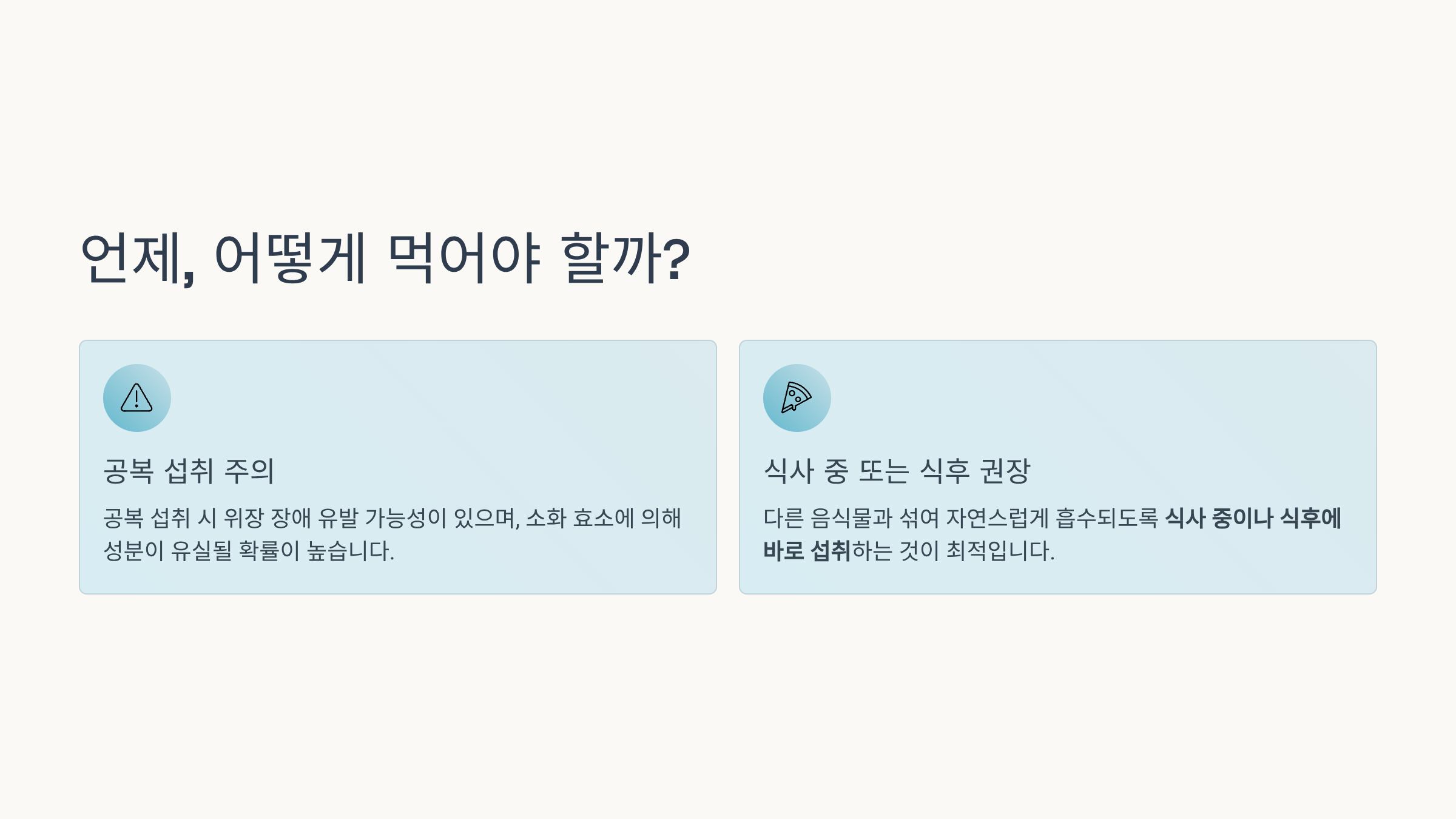 💡 섭취 꿀팁 및 주의사항 글루타치온은 공복에 섭취할 경우 위장 장애를 유발할 수 있으며 소화 효소에 의해 성분이 유실될 확률이 높습니다. 따라서 식사 중이거나 식후에 바로 섭취하여 다른 음식물과 섞여 자연스럽게 흡수되도록 유도하는 것이 좋습니다.