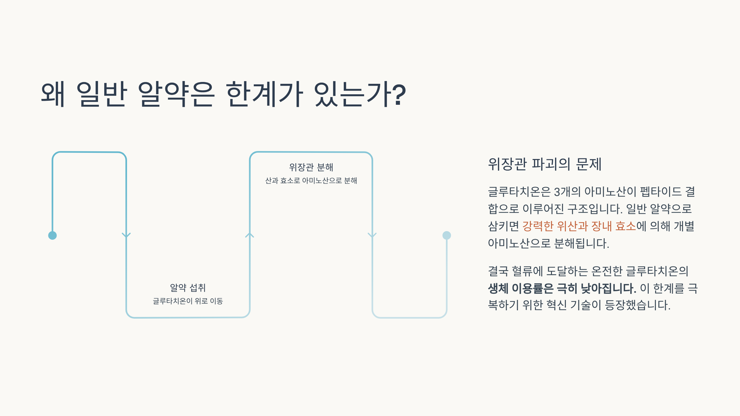 아무리 좋은 성분이라도 몸에 흡수되지 않으면 소용이 없습니다. 글루타치온 영양제 시장에서 가장 치열한 논쟁거리는 바로 '구강 섭취 시의 흡수율'입니다. 글루타치온은 3개의 아미노산이 펩타이드 결합으로 이루어진 구조이므로, 일반적인 알약 형태로 삼키게 되면 위장관을 거치는 소화 과정에서 강력한 위산과 장내 효소에 의해 개별 아미노산으로 산산조각이 나버립니다. 결국 혈류로 도달하는 온전한 글루타치온의 생체 이용률은 극히 낮아진다는 치명적인 단점이 있습니다. 이러한 위장관 파괴의 한계를 극복하기 위해 최신 제약 및 식품 공학은 다음과 같은 혁신적인 대안을 제시하고 있습니다.