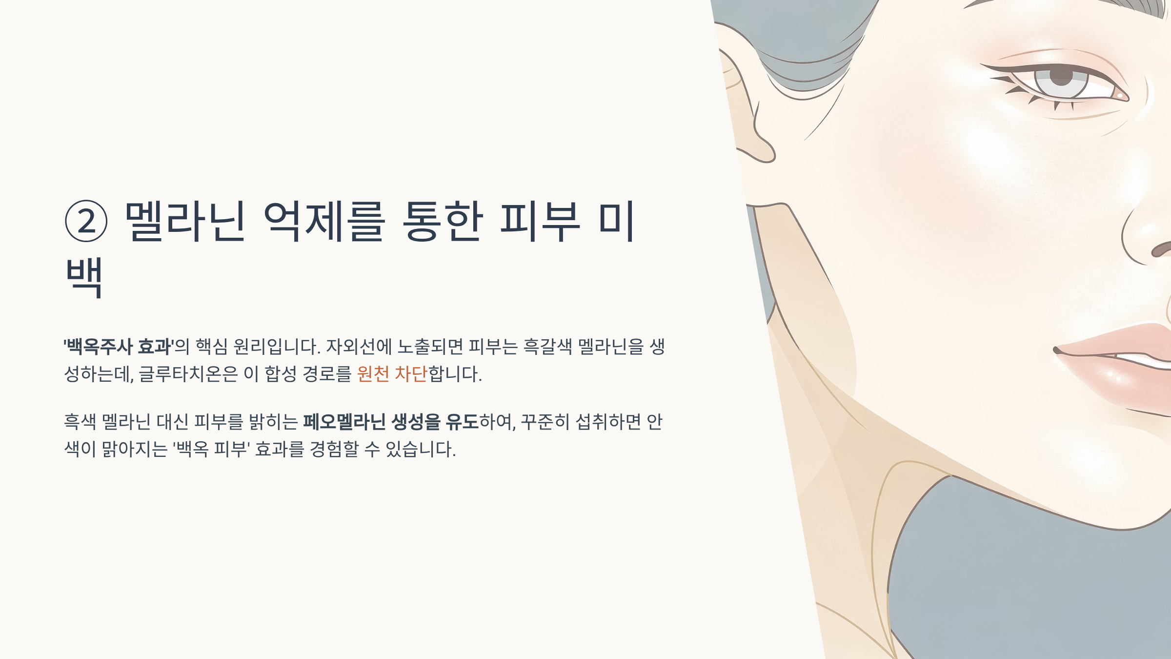 2. 멜라닌 색소 억제를 통한 피부 미백 (백옥주사 효과) 여성들이 글루타치온에 열광하는 가장 큰 이유는 단연 피부 미백 효과입니다. 자외선에 노출되면 피부는 보호를 위해 흑갈색의 멜라닌 색소를 생성하는데, 글루타치온은 이 멜라닌이 합성되는 경로를 원천적으로 차단합니다. 흑색 멜라닌의 생성을 억제하는 대신 피부를 밝게 만드는 붉은빛의 페오멜라닌 생성을 유도하여, 꾸준히 섭취할 경우 전반적인 안색이 맑아지고 투명해지는 이른바 '백옥 피부' 효과를 경험할 수 있습니다.
