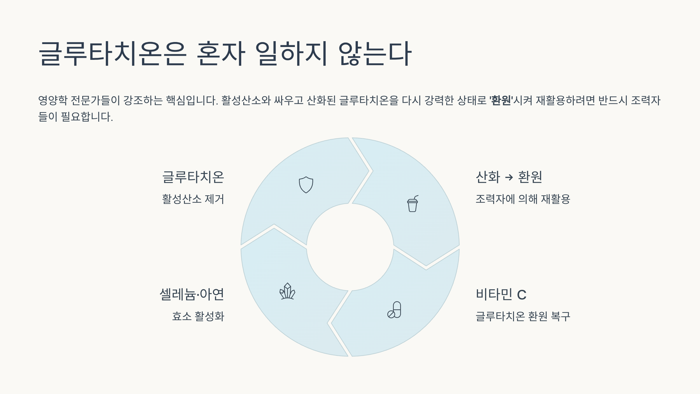 영양학 전문가들이 입을 모아 강조하는 핵심이 있습니다. 글루타치온은 결코 단독으로 일하지 않는다는 점입니다. 체내에서 활성산소와 싸우고 산화되어 기능이 다한 글루타치온을 다시 원래의 강력한 상태로 '환원'시켜 재활용하려면 반드시 조력자들이 필요합니다. 이를 '항산화 네트워크'라고 부르며, 다음의 시너지 성분들을 함께 섭취할 때 극적인 효과를 경험할 수 있습니다.