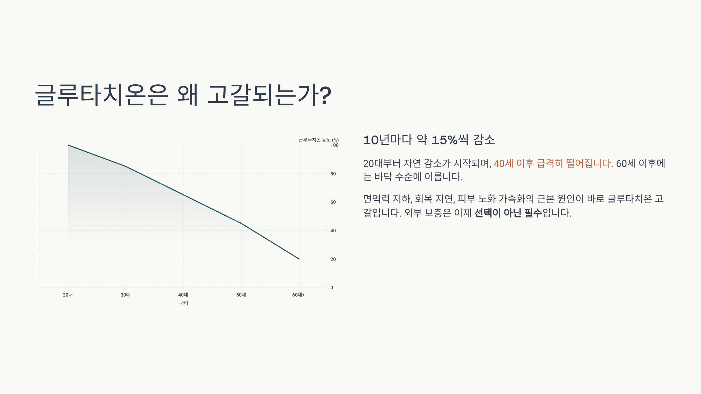 문제는 체내 글루타치온 합성량이 영원하지 않다는 것입니다. 우리 몸의 글루타치온 농도는 20대부터 10년마다 약 15%씩 자연적으로 감소하기 시작하며, 40세 이후부터는 그 수치가 급격하게 떨어지고 60세 이후에는 바닥을 향해 곤두박질칩니다. 나이가 들면서 면역력이 떨어지고, 회복 속도가 더뎌지며, 피부 노화가 가속화되는 근본적인 원인 중 하나가 바로 이 글루타치온의 고갈 때문입니다. 따라서 외부로부터의 적극적인 보충은 선택이 아닌 필수가 되었습니다.