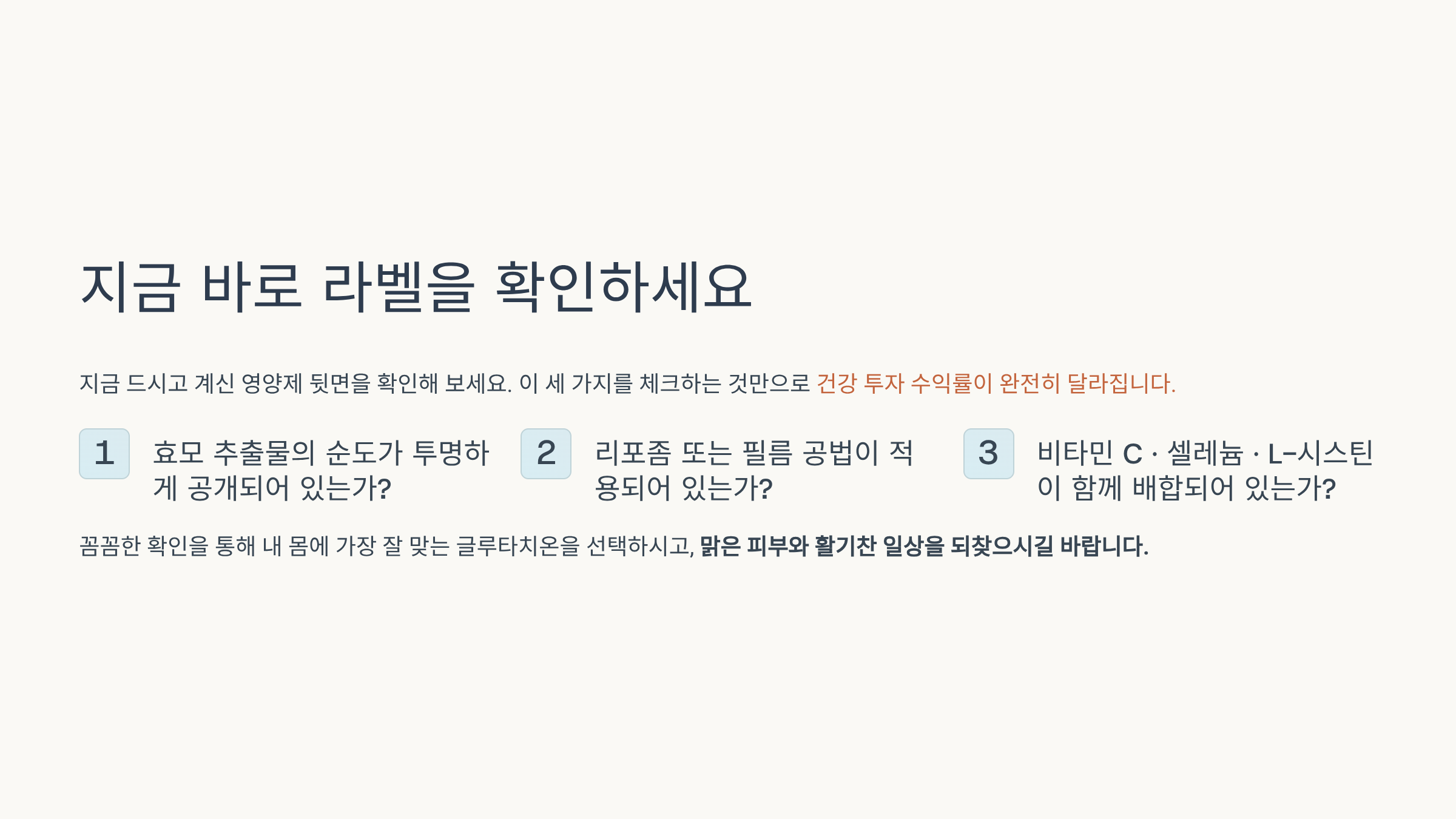 지금 당장 드시고 계신 영양제 라벨을 뒤집어 뒷면을 확인해 보시기 바랍니다. 효모 추출물의 순도가 투명하게 공개되어 있는지, 흡수율을 높이는 리포좀이나 필름 공법이 적용되었는지, 그리고 비타민 C와 셀레늄 같은 든든한 조력자들이 함께 배합되어 있는지 체크하는 것만으로도 여러분의 건강 투자 수익률은 완전히 달라질 것입니다. 꼼꼼한 확인을 통해 내 몸에 가장 잘 맞는 글루타치온을 선택하시고, 잃어버렸던 맑은 피부와 활기찬 일상을 되찾으시길 바랍니다.