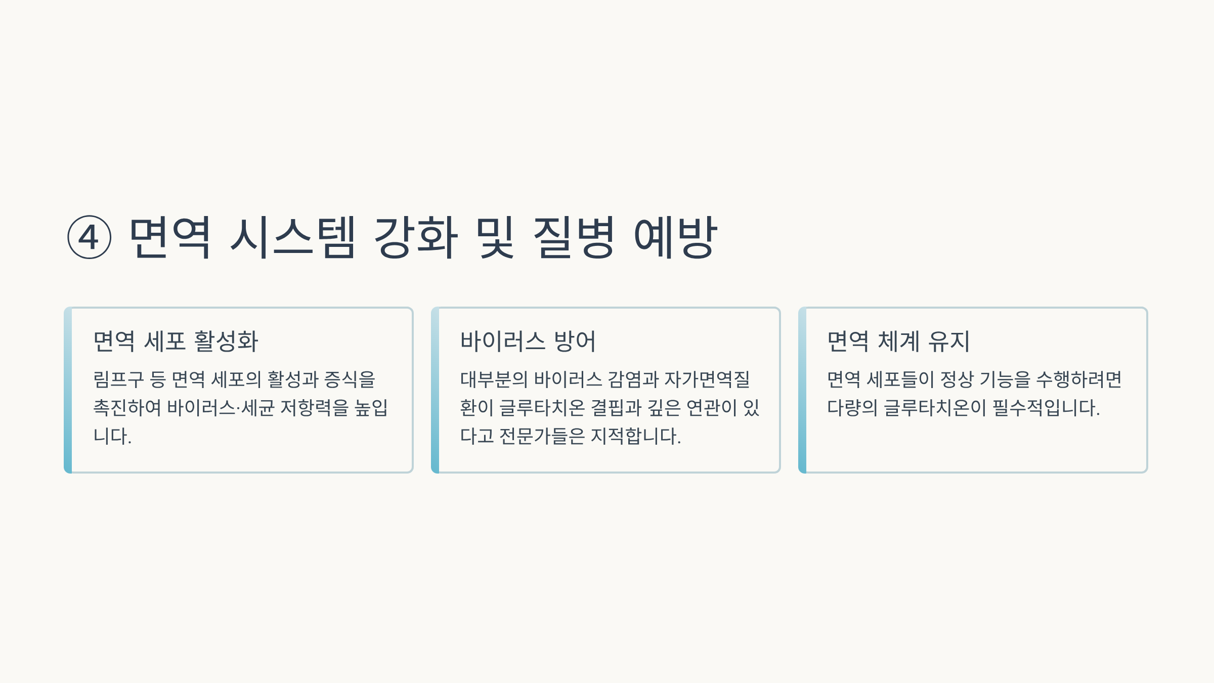 4. 면역 시스템 강화 및 질병 예방 우리 몸의 방어벽인 면역 세포들 역시 정상적인 기능을 수행하기 위해 다량의 글루타치온을 필요로 합니다. 글루타치온은 림프구와 같은 면역 세포의 활성과 증식을 촉진하여 외부에서 침입한 바이러스나 세균에 대한 저항력을 높여줍니다. 전문가들은 대부분의 바이러스 감염과 자가면역질환이 체내 글루타치온 결핍과 깊은 연관이 있다고 지적할 만큼 면역 체계 유지에 지대한 역할을 수행합니다.