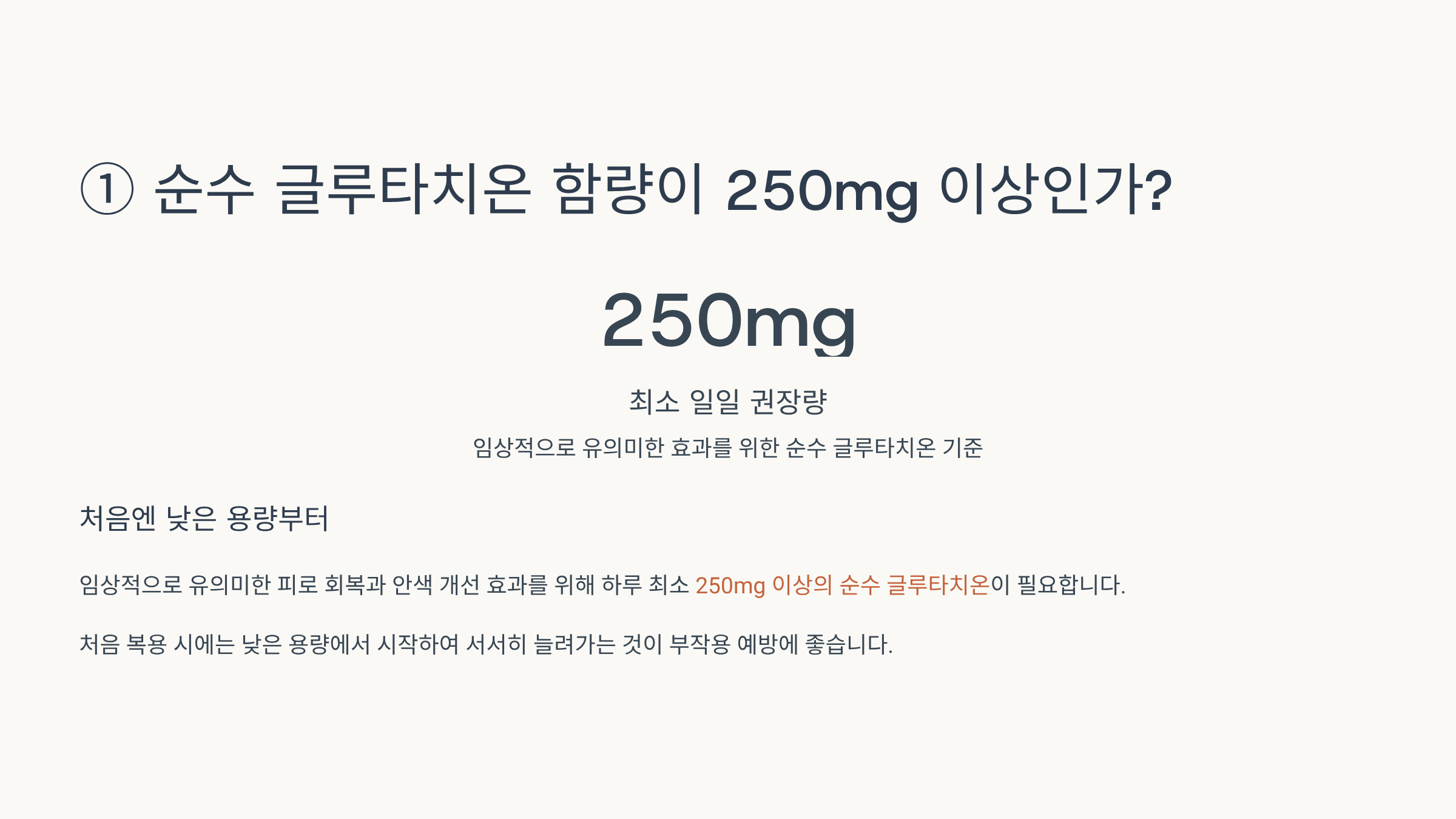 1. '순수 글루타치온' 함량이 250mg 이상인가? 임상적으로 유의미한 피로 회복과 안색 개선 효과를 보기 위해서는 하루 최소 250mg 이상의 '순수' 글루타치온이 체내에 공급되어야 합니다. 처음 복용을 시작할 때는 낮은 용량에서 시작하여 서서히 용량을 늘려가는 것이 몸의 적응을 돕고 부작용을 예방하는 좋은 방법입니다.