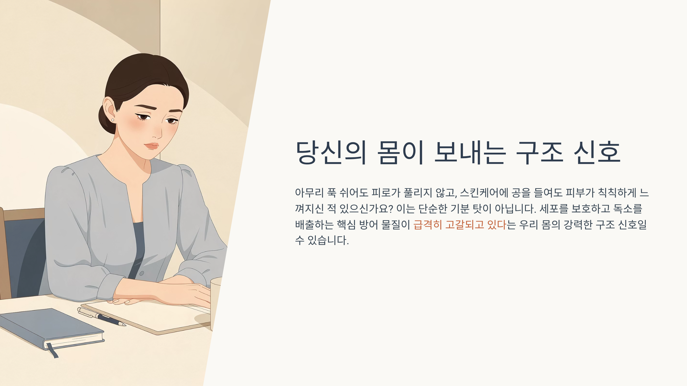 아무리 푹 쉬어도 피로가 풀리지 않고, 예전과 달리 스킨케어에 공을 들여도 거울 속 피부가 칙칙하게 느껴지신 적이 있으신가요? 이러한 현상은 단순히 기분 탓이 아닙니다. 우리 몸속에서 세포를 보호하고 독소를 배출하는 핵심 방어선인 특정 물질이 급격하게 고갈되고 있다는 우리 몸의 강력한 구조 신호일 수 있습니다.