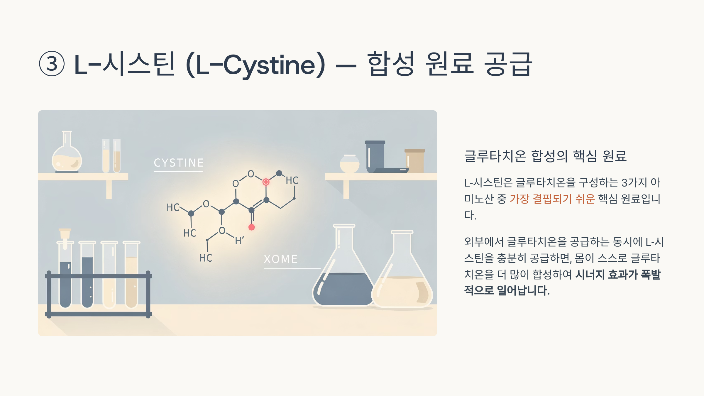 3. L-시스틴 (L-Cystine) L-시스틴은 글루타치온을 구성하는 3가지 아미노산 중 가장 결핍되기 쉬운 핵심 원료입니다. 외부에서 글루타치온을 공급해 주는 것과 동시에, 우리 몸이 스스로 글루타치온을 더 많이 만들어 낼 수 있도록 공장의 원료인 L-시스틴을 충분히 공급해 주면 체내 합성률이 극대화되어 시너지 효과가 폭발적으로 일어납니다.