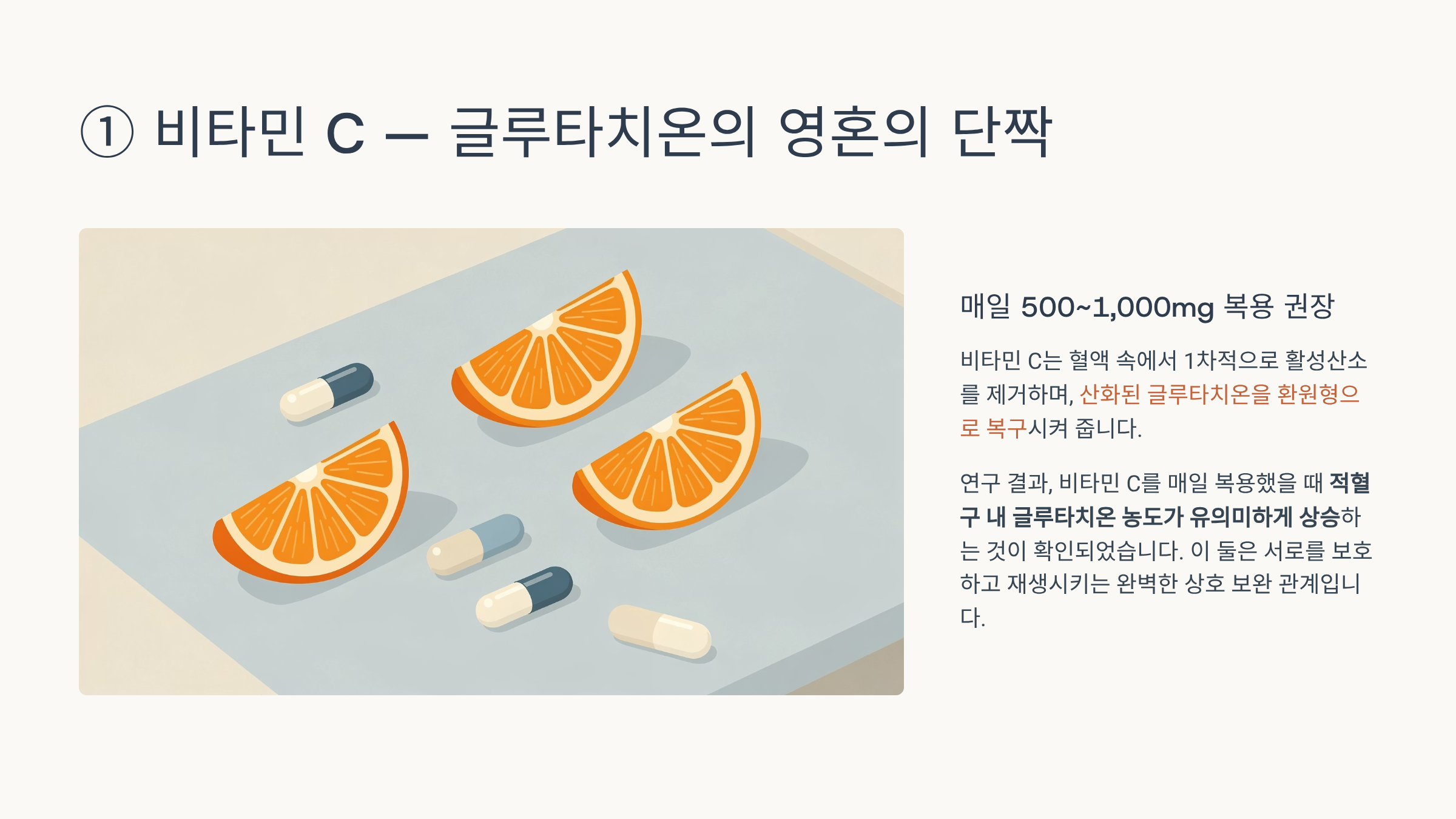 1. 비타민 C (Vitamin C) 비타민 C는 글루타치온과 영혼의 단짝입니다. 비타민 C는 혈액 속에서 1차적으로 활성산소를 제거하며, 산화된 글루타치온을 다시 환원형으로 복구시켜 줍니다. 여러 연구 결과에 따르면 비타민 C를 매일 500~1,000mg 복용했을 때 적혈구 내 글루타치온 농도가 유의미하게 상승하는 것으로 확인되었습니다. 이 둘은 서로를 보호하고 재생시키는 완벽한 상호 보완 관계를 형성합니다.