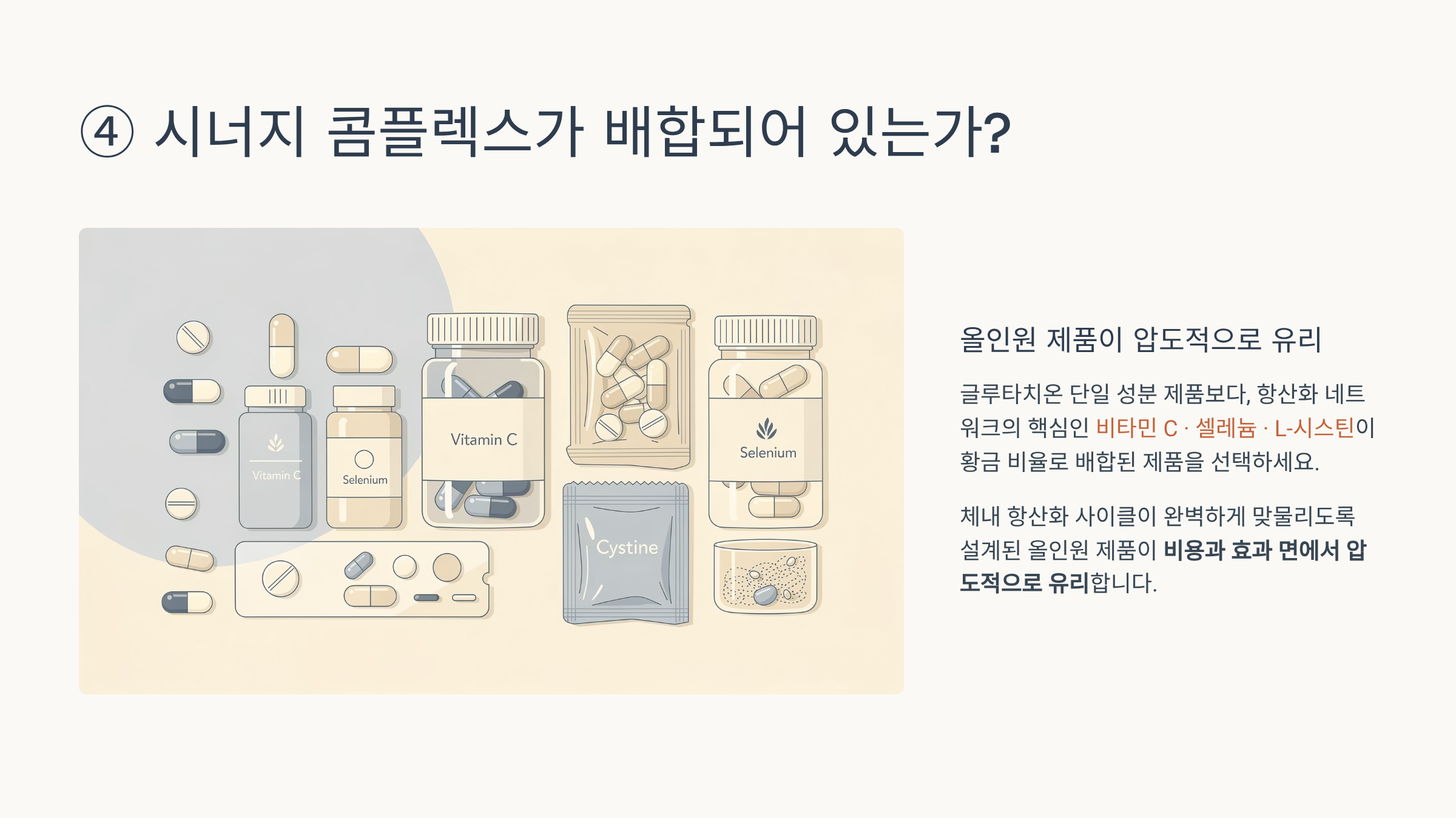 4. 시너지 콤플렉스가 배합되어 있는가? 글루타치온 단일 성분만 덩그러니 들어있는 제품보다는, 앞서 언급한 항산화 네트워크의 핵심인 비타민C, 셀레늄, L-시스틴이 함께 황금 비율로 배합된 제품을 골라야 합니다. 제품 하나만으로도 체내 항산화 사이클이 완벽하게 맞물려 돌아가도록 설계된 올인원 제품을 고르는 것이 비용과 효과 면에서 압도적으로 유리합니다.