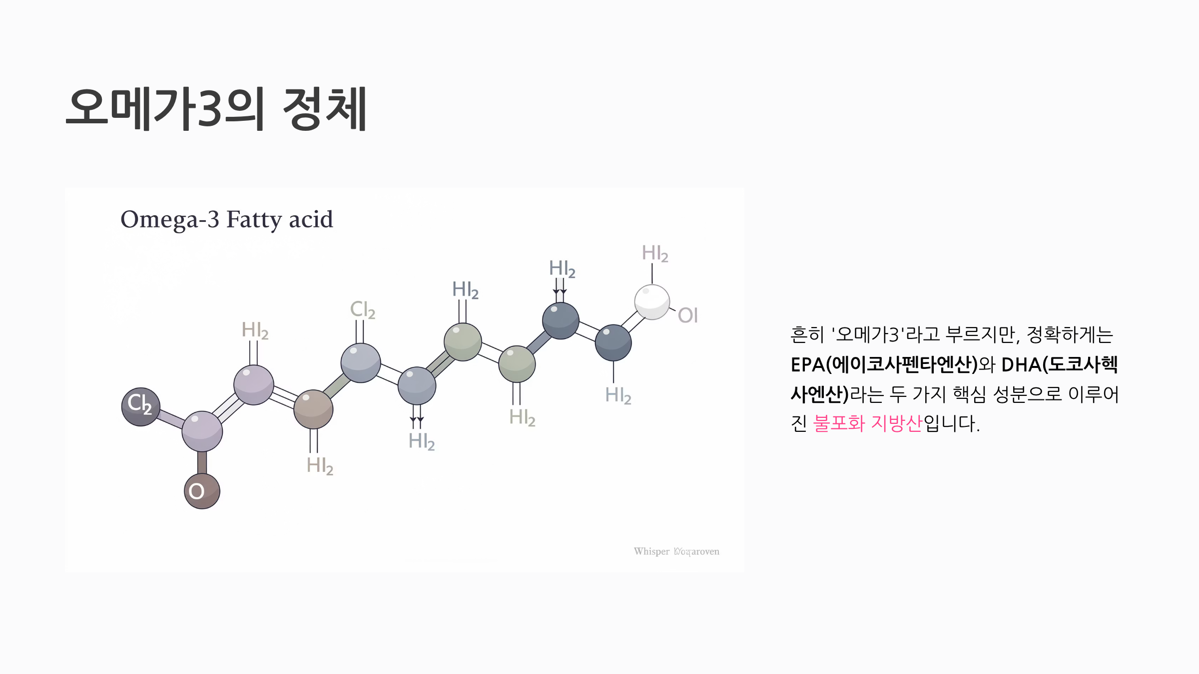 흔히 오메가3라고 부르지만, 정확하게는 EPA(에이코사펜타엔산)와 DHA(도코사헥사엔산)라는 두 가지 핵심 성분으로 이루어진 불포화 지방산입니다.