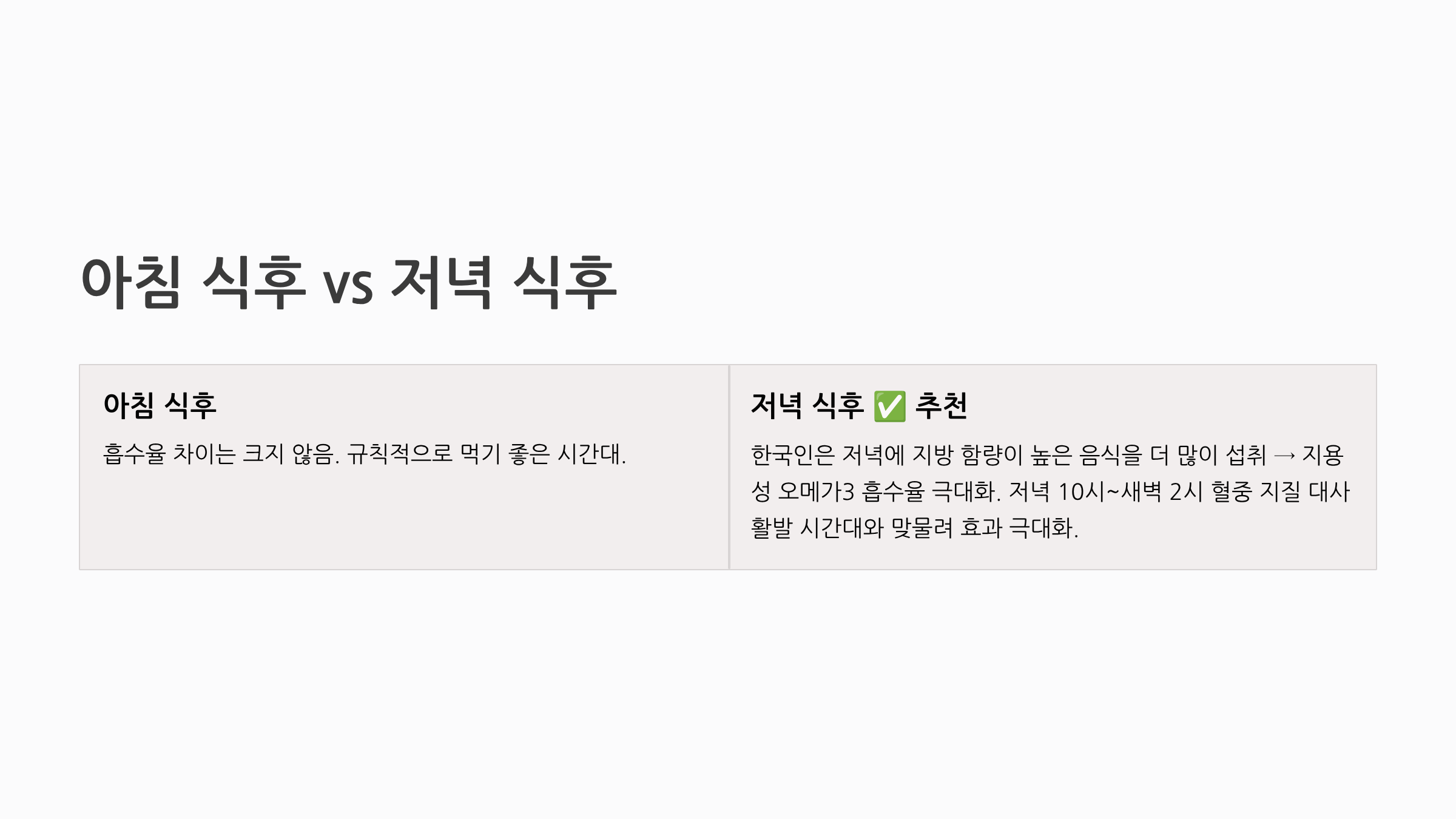 ⏰ 오메가3 먹는 시간 핵심 정리 | 아침 vs 저녁, 공복 vs 식후
