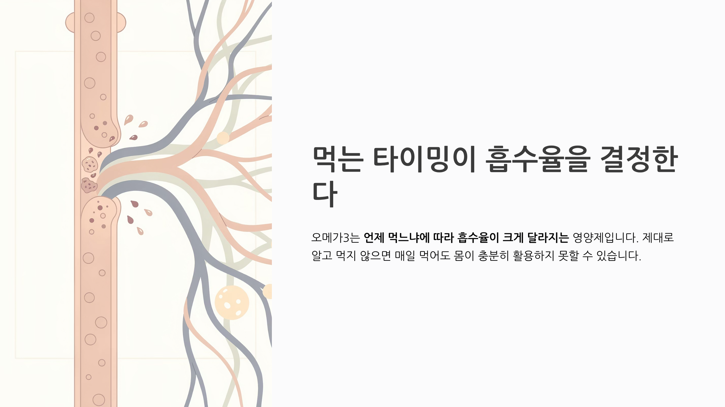 오메가3, 챙겨 드시고 계신가요? 주변에서 "몸에 좋다"고 해서 사놓은 채 아무 때나 생각날 때마다 한 알씩 털어넣는 분들 정말 많습니다. 아침에 일어나자마자 먹기도 하고, 자기 전에 생각나서 먹기도 하고, 심지어 공복에 먹다가 비린 냄새에 고생하신 적도 있을 텐데요.