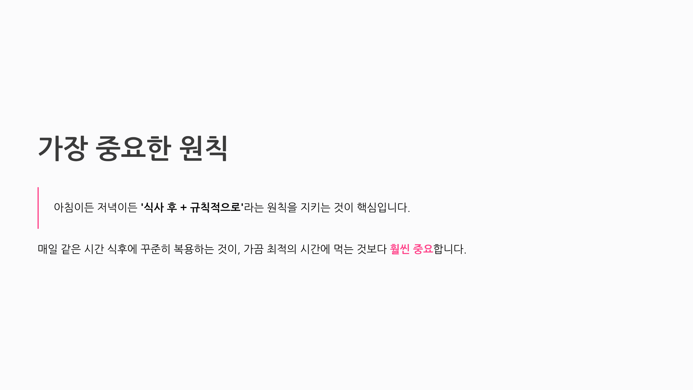 가장 중요한 것은 아침이든 저녁이든 '식사 후 + 규칙적으로'라는 원칙을 지키는 것입니다. 매일 같은 시간 식후에 꾸준히 복용하는 것이 가끔 최적의 시간에 먹는 것보다 훨씬 중요합니다.