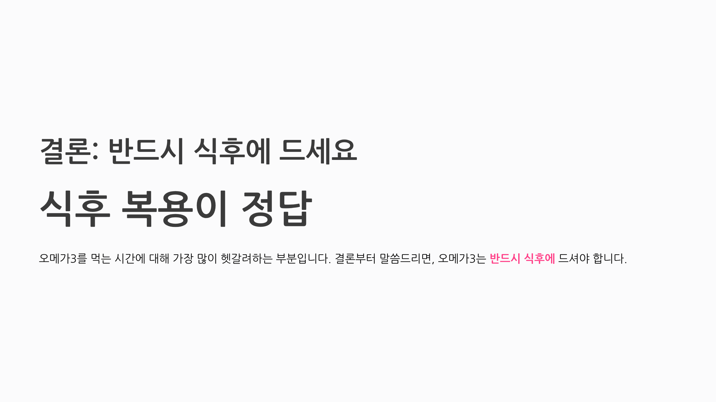 오메가3를 먹는 시간에 대해 가장 많이 헷갈려하는 부분입니다. 결론부터 말씀드리면, 오메가3는 반드시 식후에 드셔야 합니다.