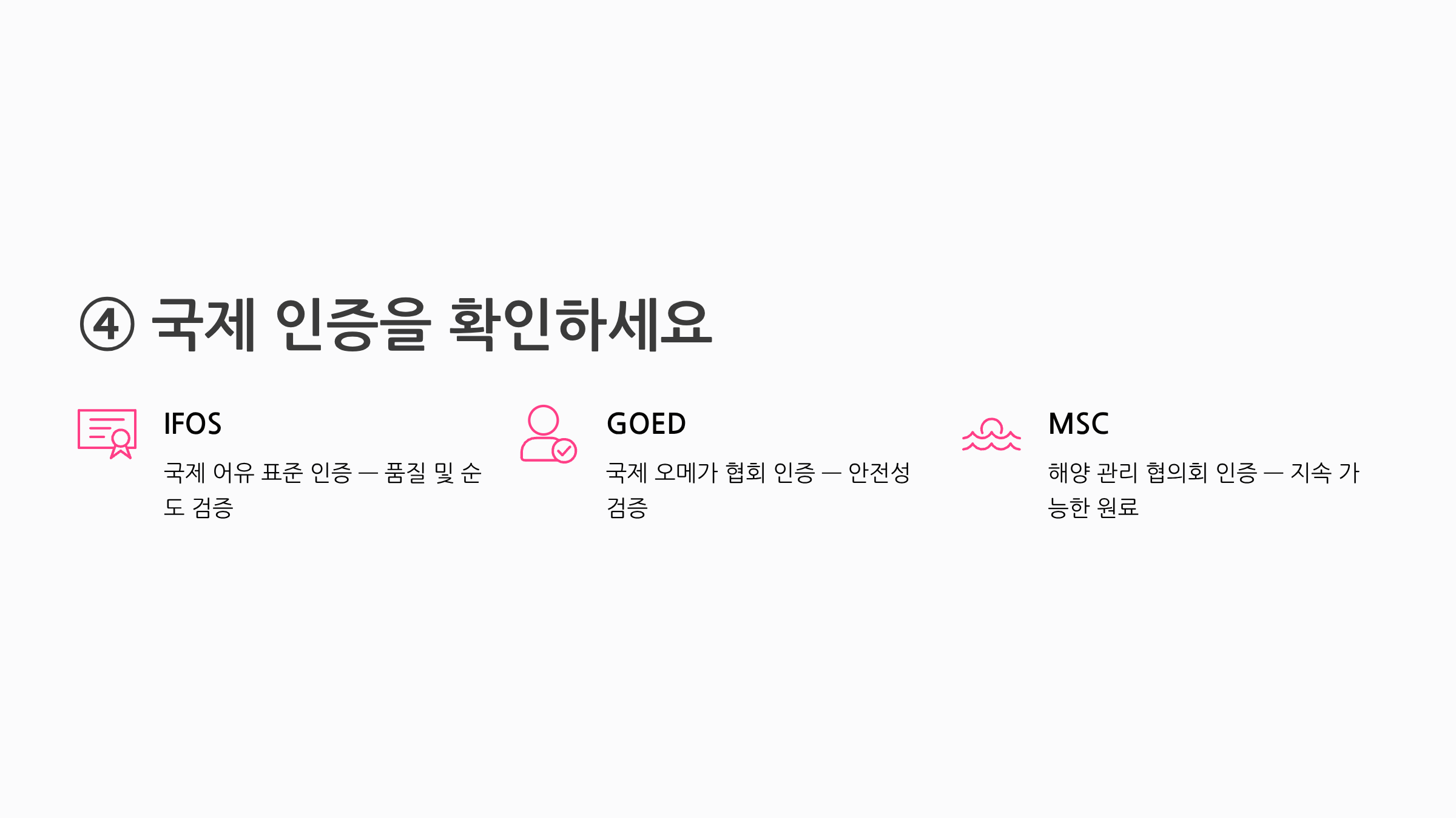 네 번째는 국제 인증을 확인하는 것입니다. IFOS(국제 어유 표준), GOED(국제 오메가 협회), MSC(해양 관리 협의회) 인증 마크가 있는 제품은 품질과 안전성이 검증된 제품입니다.