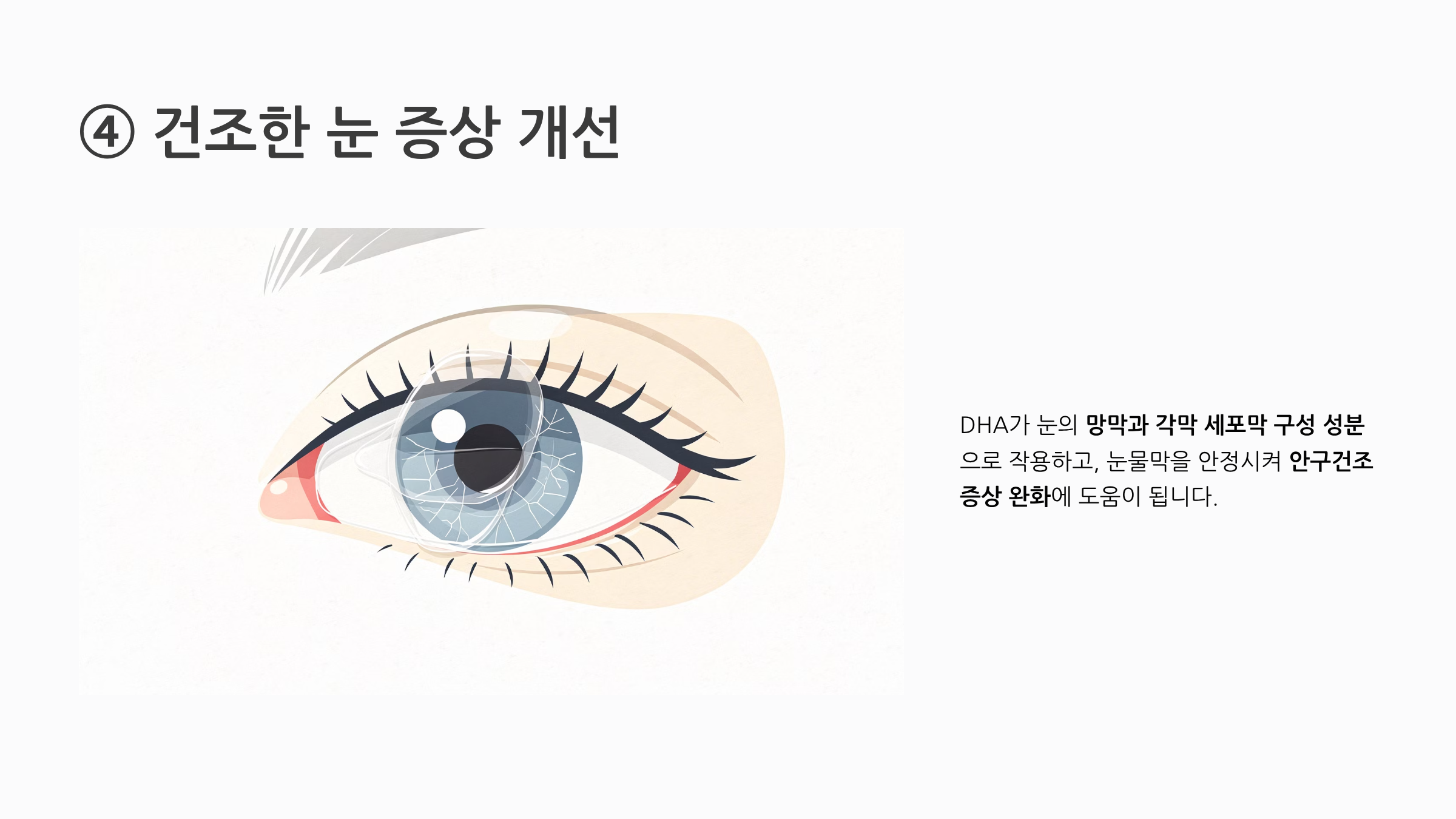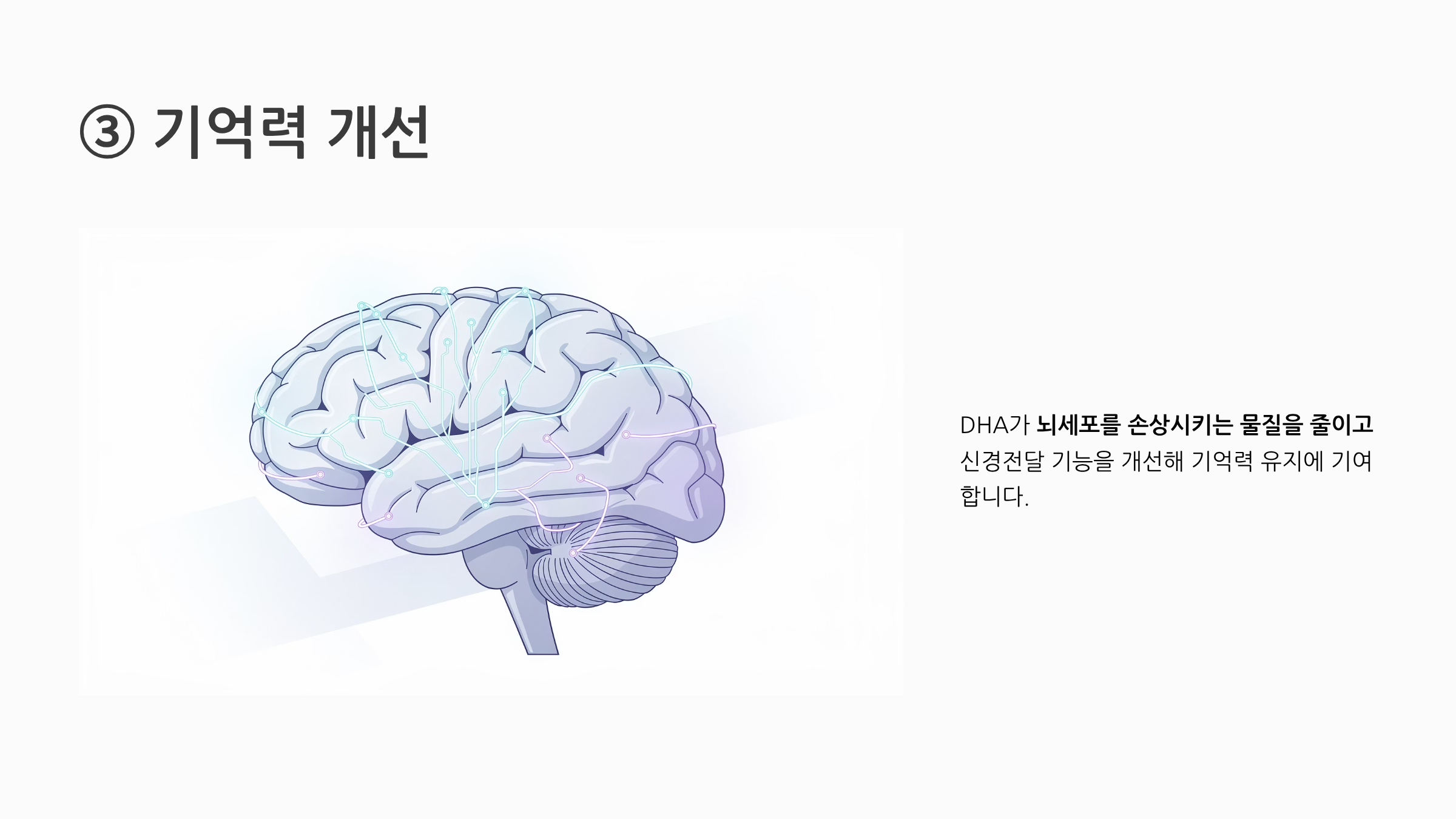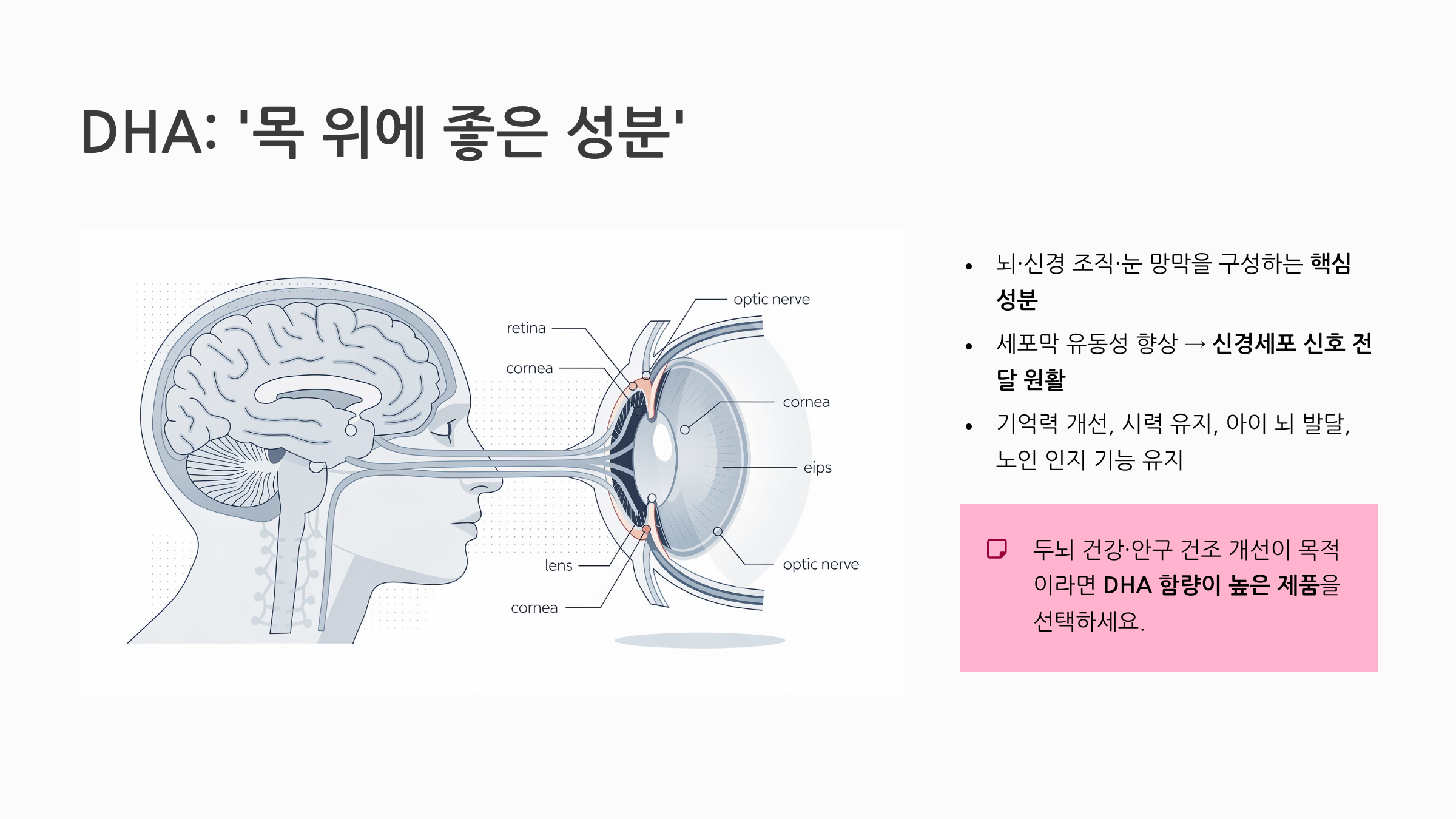 DHA는 '목 위에 좋은 성분'입니다. 뇌, 신경 조직, 눈의 망막을 구성하는 핵심 성분으로, 세포막 유동성을 높여 신경세포 간 신호 전달을 원활하게 합니다. 기억력 개선, 시력 유지, 성장기 아이들의 뇌 발달, 노인의 인지 기능 유지에 특히 중요합니다. 두뇌 건강이나 안구 건조 개선이 목적이라면 DHA 함량이 높은 제품을 고르는 것이 좋습니다.