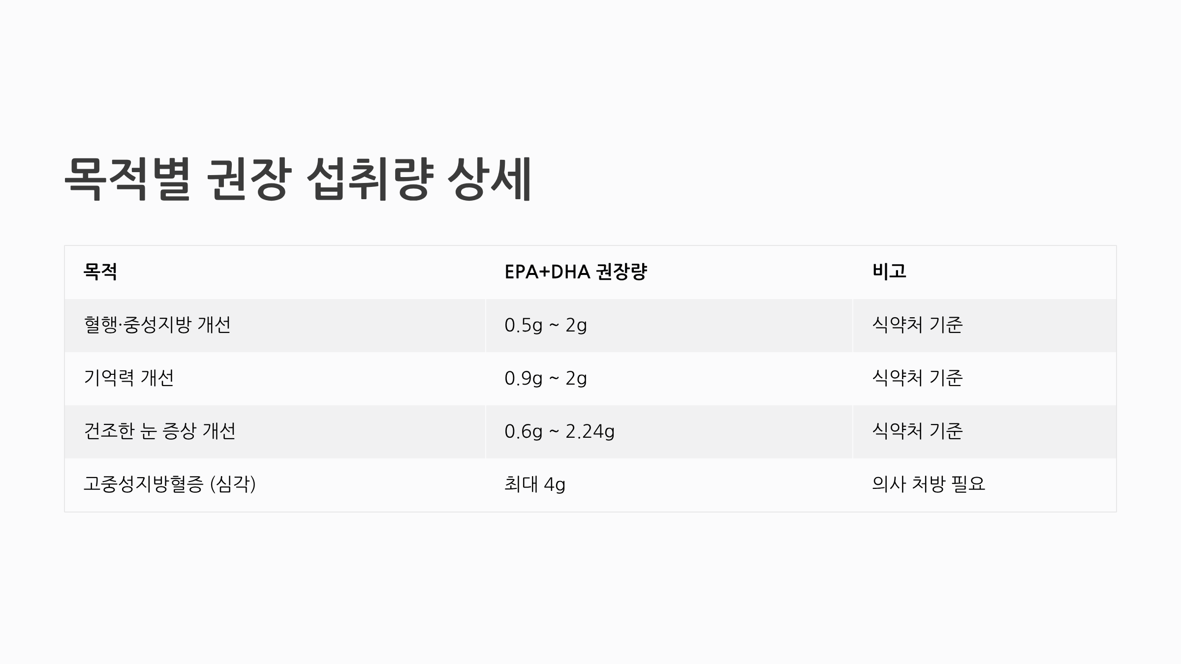 혈행 개선과 혈중 중성지방 개선을 위해서는 EPA+DHA 합계 0.5g~2g이 권장됩니다. 기억력 개선 목적이라면 0.9g~2g, 건조한 눈 증상 개선을 위해서는 0.6g~2.24g이 권장됩니다. 고중성지방혈증이 심각한 경우에는 의사 처방 하에 최대 4g까지 복용하는 경우도 있습니다.
