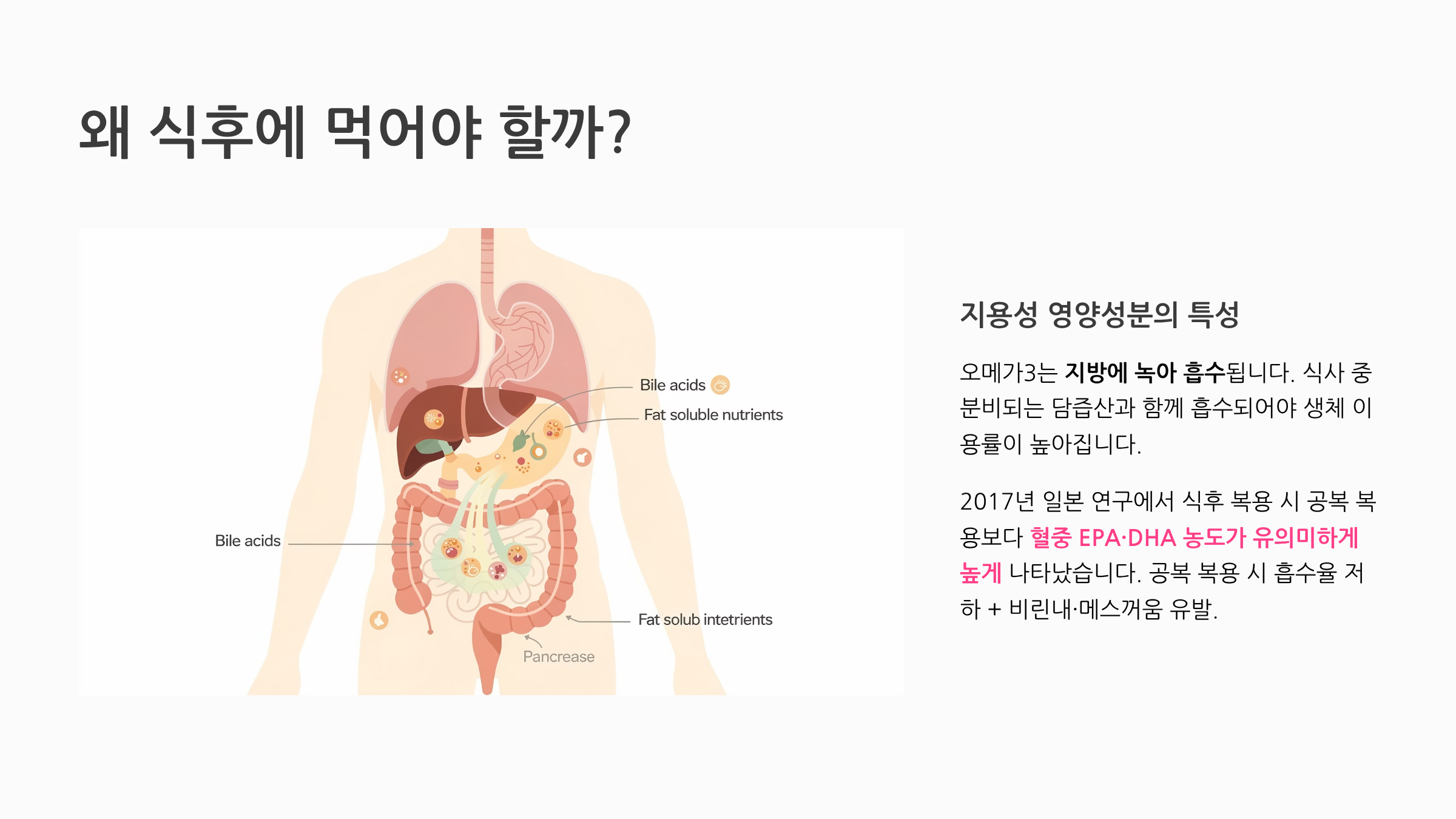 오메가3는 지용성 영양성분입니다. 지방에 녹아 흡수되는 특성이 있기 때문에, 식사 중 분비되는 담즙산과 함께 흡수되어야 생체 이용률이 높아집니다. 실제로 2017년 일본 건강한 성인 남성을 대상으로 한 연구에서 오메가3를 식후 복용했을 때 공복 복용보다 혈중 EPA·DHA 농도가 유의미하게 높게 나타났습니다. 공복 복용 시에는 흡수율이 낮을 뿐 아니라, 비린내가 올라오고 메스꺼움이 생기는 불편함도 있습니다.