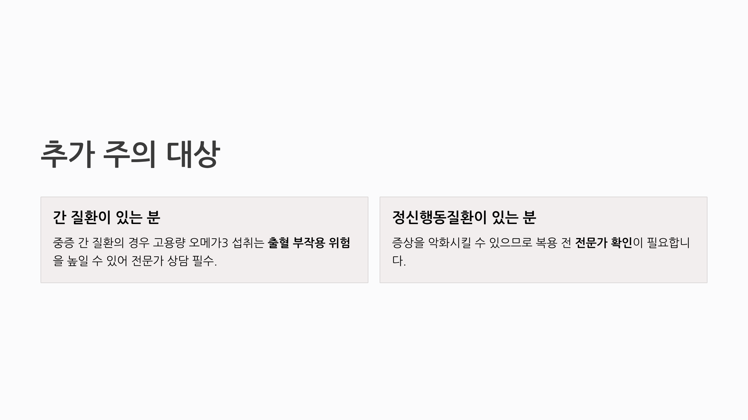 간 질환이 있는 분들도 주의해야 합니다. 중증 간 질환이 있는 경우 고용량 오메가3 섭취는 출혈 부작용 위험을 높일 수 있어 반드시 전문가와 상담이 필요합니다. 정신행동질환이 있는 경우에도 증상을 악화시킬 수 있으므로 복용 전 전문가 확인이 필요합니다.