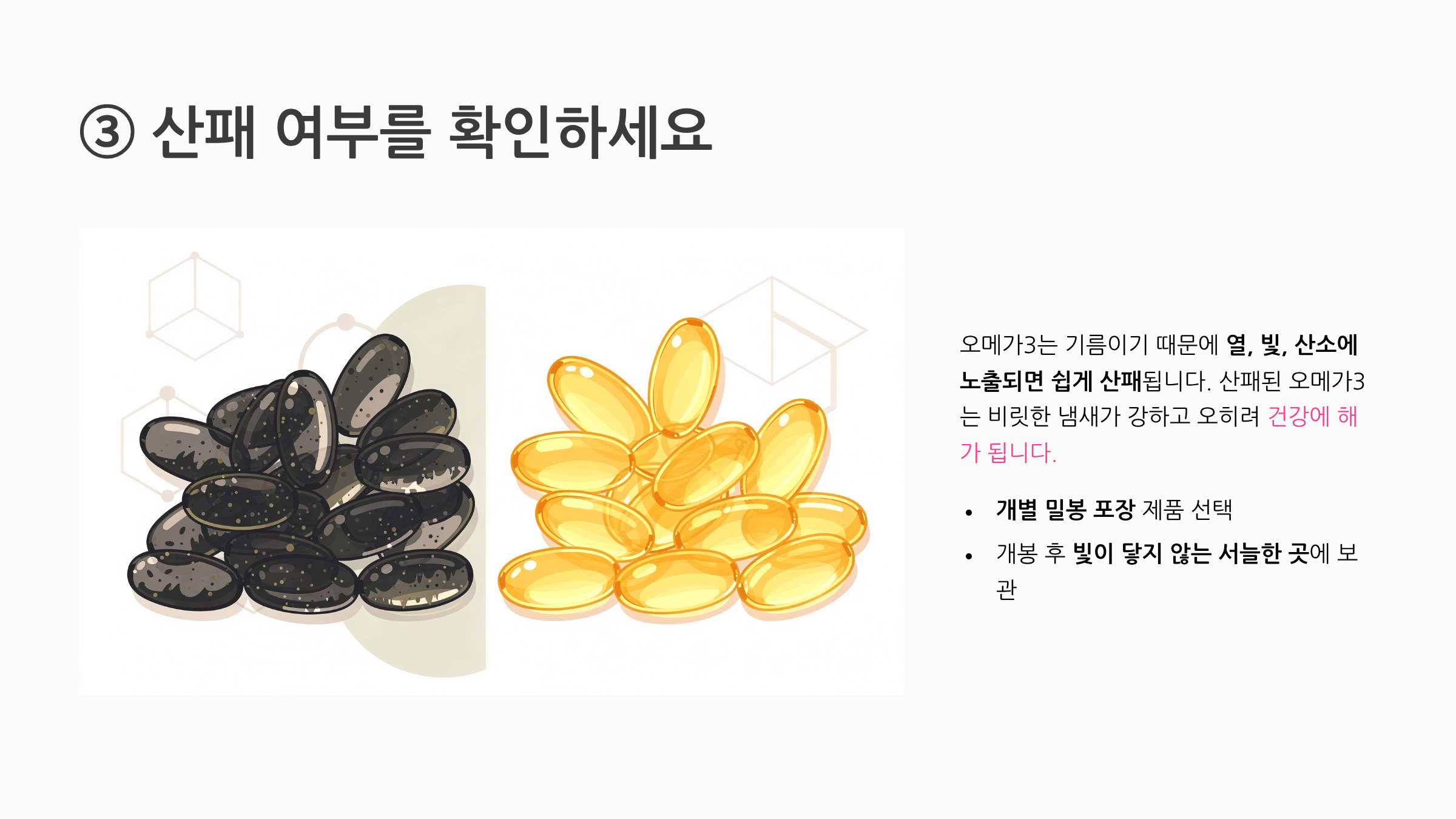 세 번째는 산패 여부입니다. 오메가3는 기름이기 때문에 열, 빛, 산소에 노출되면 쉽게 산패됩니다. 산패된 오메가3는 비릿한 냄새가 강하고 오히려 건강에 해가 됩니다. 개별 밀봉 포장 제품을 선택하고, 개봉 후에는 빛이 닿지 않는 서늘한 곳에 보관하세요.