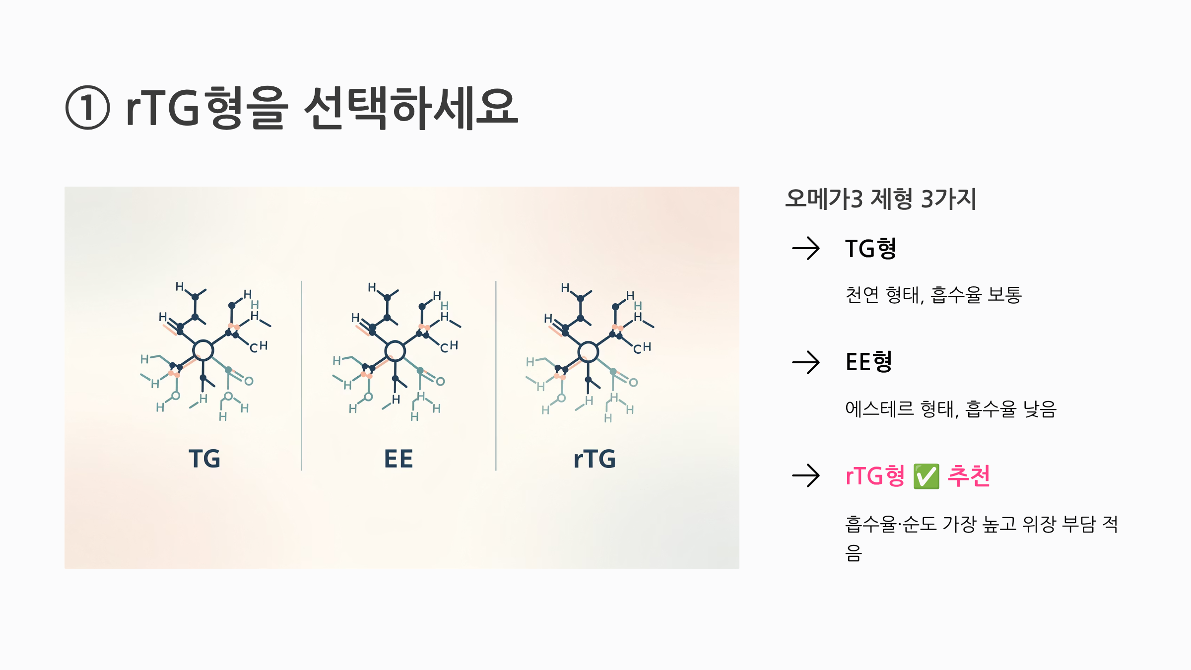 첫 번째는 rTG형을 선택하는 것입니다. 오메가3는 구조에 따라 TG형, EE형, rTG형으로 나뉘는데, rTG형이 흡수율과 순도가 가장 높고 위장 부담도 적어 현재 가장 선호되는 제형입니다.